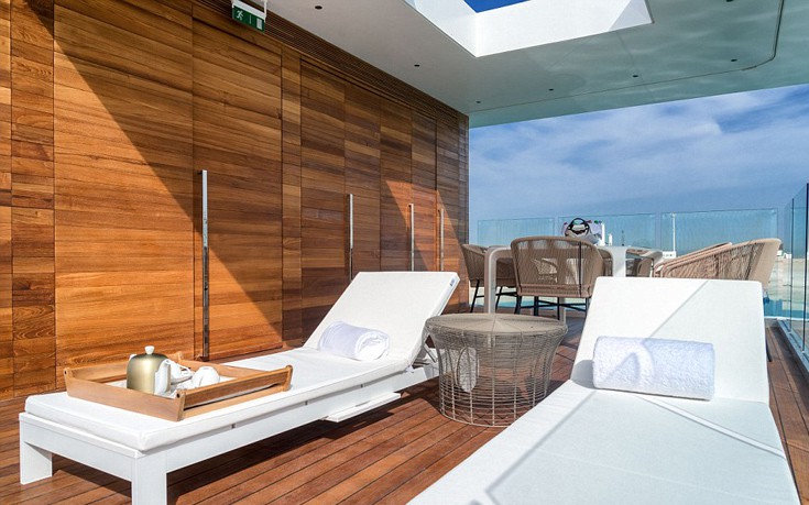 Στο επάνω επίπεδο, οι τυχεροί επισκέπτες θα έχουν την ευκαιρία να κάνουν υδρομασάζ, ένα εξωτερικό ντους, να πιουν το ποτό τους στο μπαρ, ενώ υπάρχει επιπλέον και μια μικρή κουζίνα. Ένα τμήμα του χώρου μπορεί να μετατραπεί σε ένα υπαίθριο υπνοδωμάτιο για όποιον θέλει να χαλαρώσει για λίγο.