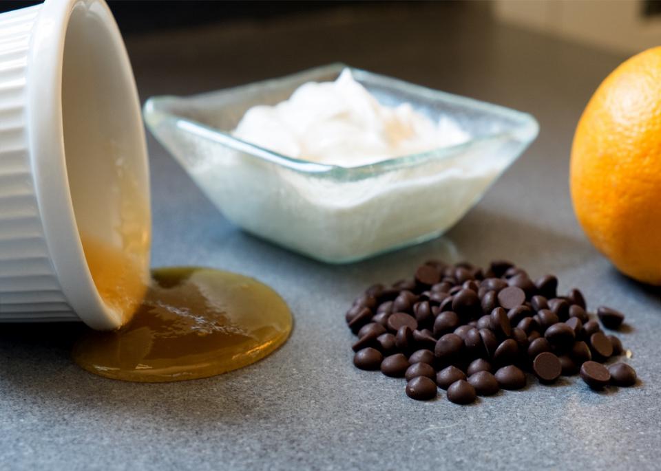 Κόβουμε τα πορτοκάλια στη μέση και τα στύβουμε πολύ καλά. Αδειάζουμε το χυμό σε ένα μπολ και κρατάμε τις κούπες του πορτοκαλιού. Προσθέτουμε το γιαούρτι, τη βανίλια, το μέλι και ανακατεύουμε με ένα κουτάλι. Στη συνέχεια προσθέτουμε και τα δάκρυα σοκολάτας και ανακατεύουμε μέχρι να ομογενοποιηθεί το μείγμα. Αδειάζουμε το μείγμα σε μια ορθογώνια φόρμα για κέικ, σκεπάζουμε με μια μεμβράνη η οποία εφάπτεται πάνω στο παγωτό. Αφήνουμε για τουλάχιστον 5 ώρες στην κατάψυξη έως μια νύχτα. Όταν θέλουμε να το σερβίρουμε το αφήνουμε εκτός κατάψυξης για 20-30 λεπτά, παίρνουμε κουταλιές τις βάζουμε μέσα στις κούπες πορτοκαλιού που κρατήσαμε και σερβίρουμε.