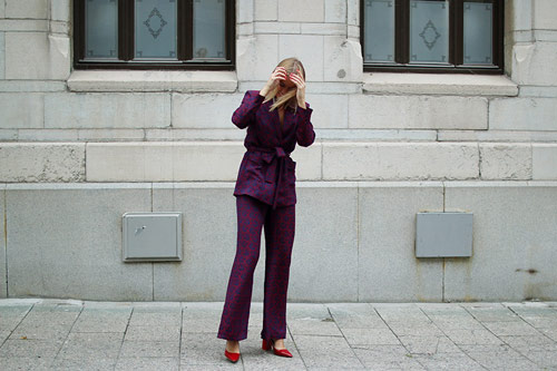 Η πιο θηλυκή εκδοχή ενός ανδρόγυνου styling. Τα χρώματα του στο μπορντό κόκκινο και στο σκούρο ναυτικό μπλε. Το αποτέλεσμα όμορφα χαοτικό. Όσο για τα κόκκινα ψηλοτάκουνα, είναι αυτά που επισφραγίζουν το look της ημέρας