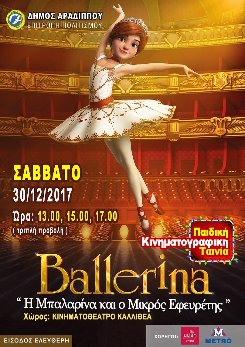 Ο Δήμος Αραδίππου προσφέρει σήμερα δωρεάν τριπλή προβολή της παιδικής κινηματογραφικής ταινίας «Η μπαλαρίνα και ο μικρός εφευρέτης», στο Κινηματοθέατρο Καλλιθέα. Η πρώτη προβολή θα αρχίσει στη 1μμ και θα ακολουθήσουν άλλες δύο προβολές στις 3 και στις 5 το απόγευμα. Τα Πρωτοχρονιάτικα πακέτα μοιράζει σήμερα το Κοινωνικό Παντοπωλείο του Δήμου Αραδίππου. Στα πακέτα θα υπάρχουν εκτός από τα είδη πρώτης ανάγκης, κοτόπουλο, κρέας και όλα τα απαραίτητα για το Πρωτοχρονιάτικο τραπέζι. Το προσφέρει βοήθεια σε 150 άπορες οικογένειες.