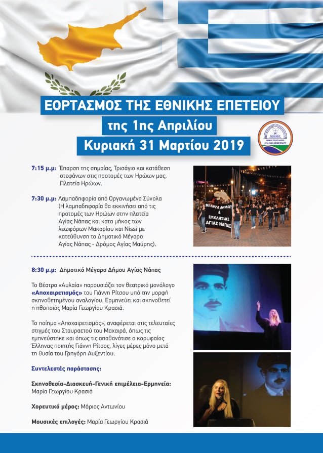 Το Θέατρο “Αυλαία”, παρουσιάζει αύριο Κυριακή 31.3.2019 στις 8.30 μ.μ., στο Δημοτικό Μέγαρο Αγίας Νάπας, τον Θεατρικό μονόλογο «Αποχαιρετισμός» του Γιάννη Ρίτσου, υπό την μορφή σκηνοθετημένου αναλογίου, ο οποίος απέσπασε θετικότατα σχόλια από το κοινό. Ερμηνεύει και σκηνοθετεί η ηθοποιός Μαρία Γεωργίου Κρασιά.