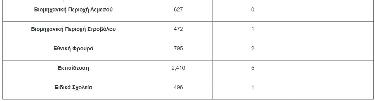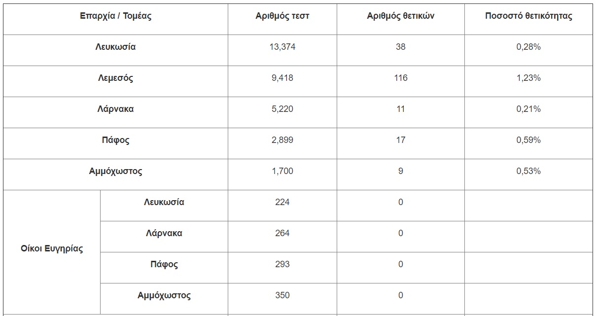 • 200 κρούσματα από 38,542 δείγματα που εξετάστηκαν με τη μέθοδο ταχείας ανίχνευσης αντιγόνου (antigen rapid test) μέσω του προγράμματος του Υπουργείου Υγείας.