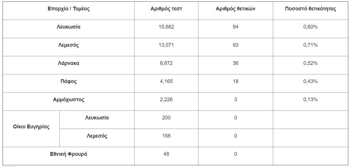 - 244 κρούσματα από 42,422 δείγματα που εξετάστηκαν με τη μέθοδο ταχείας ανίχνευσης αντιγόνου (antigen rapid test) μέσω του προγράμματος του Υπουργείου Υγείας.