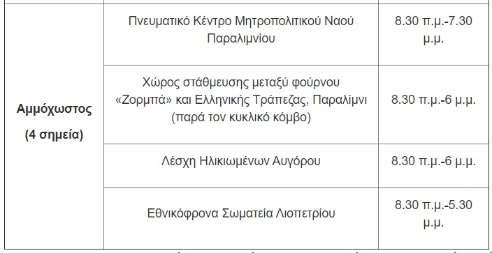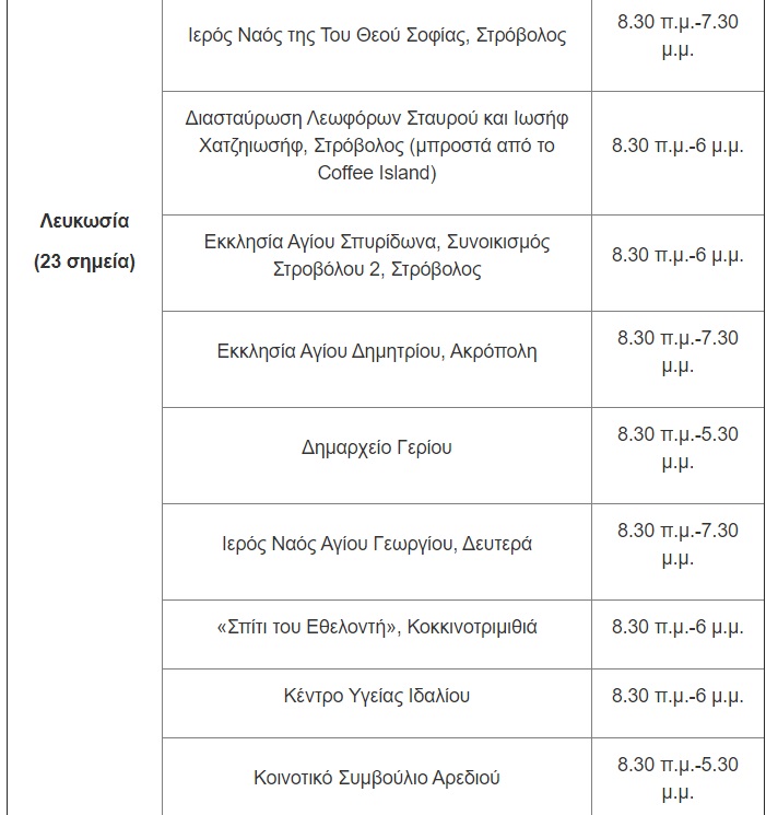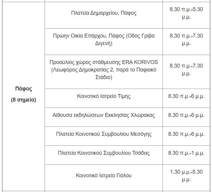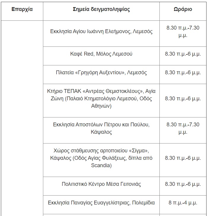 Ως εκ τούτου, οι εργαζόμενοι μπορούν να προσέρχονται στα σημεία δειγματοληψίας που λειτουργούν σε όλες τις Επαρχίες, σύμφωνα με το πλάνο που καταρτίζει ο εργοδότης/προϊστάμενος. Για το Σάββατο, 3 Απριλίου, οι μονάδες δειγματοληψίας θα βρίσκονται στις ακόλουθες τοποθεσίες:
