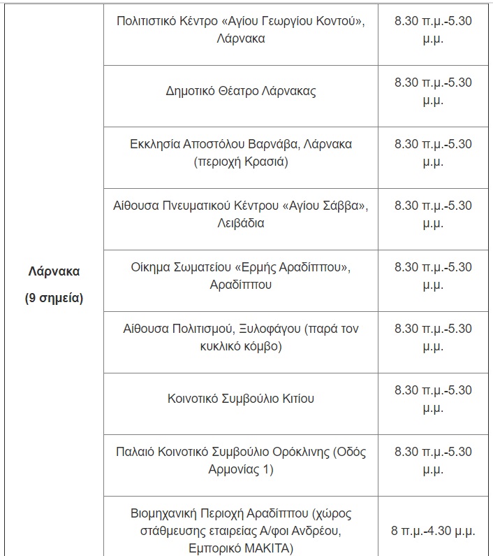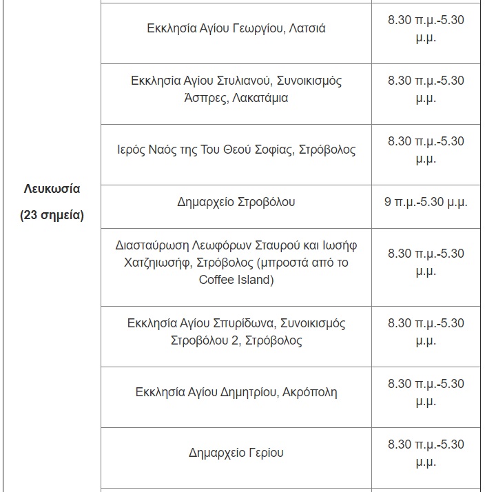 Ως εκ τούτου, οι εργαζόμενοι μπορούν να προσέρχονται στα σημεία δειγματοληψίας που λειτουργούν σε όλες τις Επαρχίες, σύμφωνα με το πλάνο που καταρτίζει ο εργοδότης/προϊστάμενος. Για την Παρασκευή, 2 Απριλίου, οι μονάδες δειγματοληψίας θα βρίσκονται στις ακόλουθες τοποθεσίες: