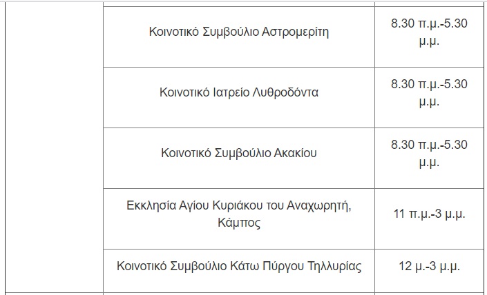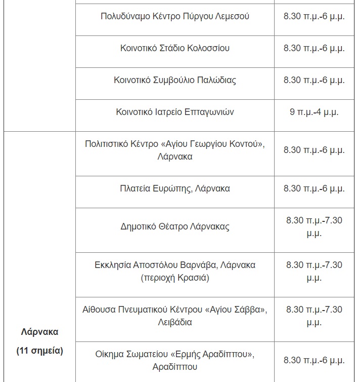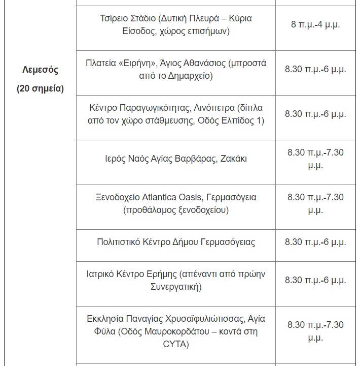 Ως εκ τούτου, οι εργαζόμενοι μπορούν να προσέρχονται στα σημεία δειγματοληψίας που λειτουργούν σε όλες τις Επαρχίες, σύμφωνα με το πλάνο που καταρτίζει ο εργοδότης/προϊστάμενος. Για το Σάββατο, 3 Απριλίου, οι μονάδες δειγματοληψίας θα βρίσκονται στις ακόλουθες τοποθεσίες: