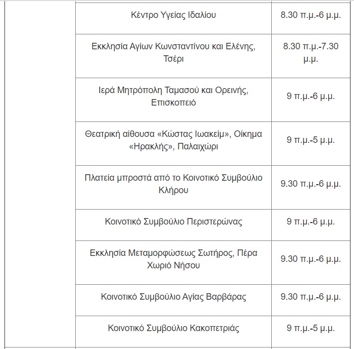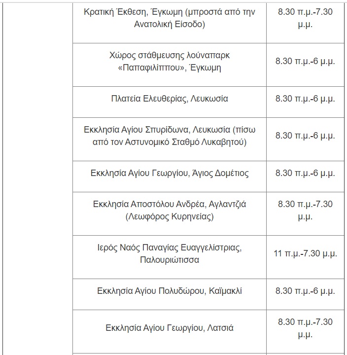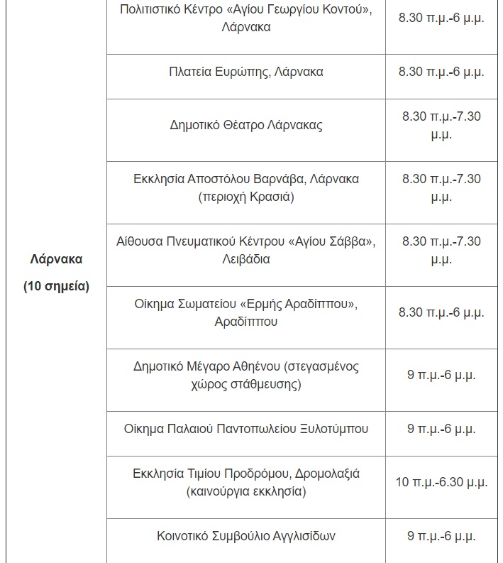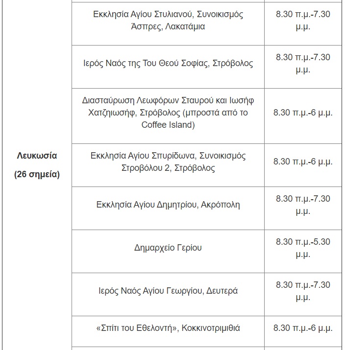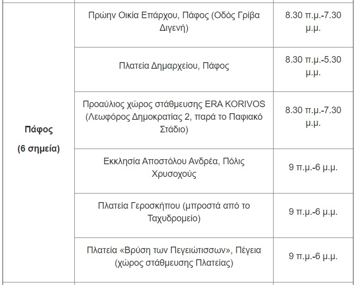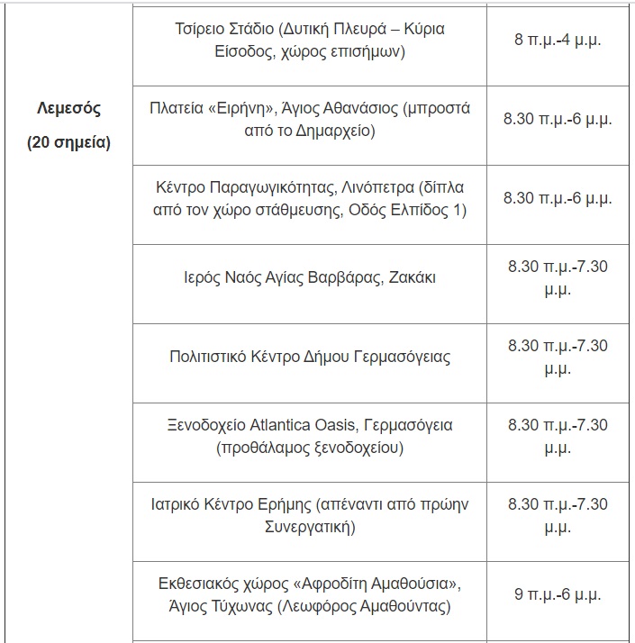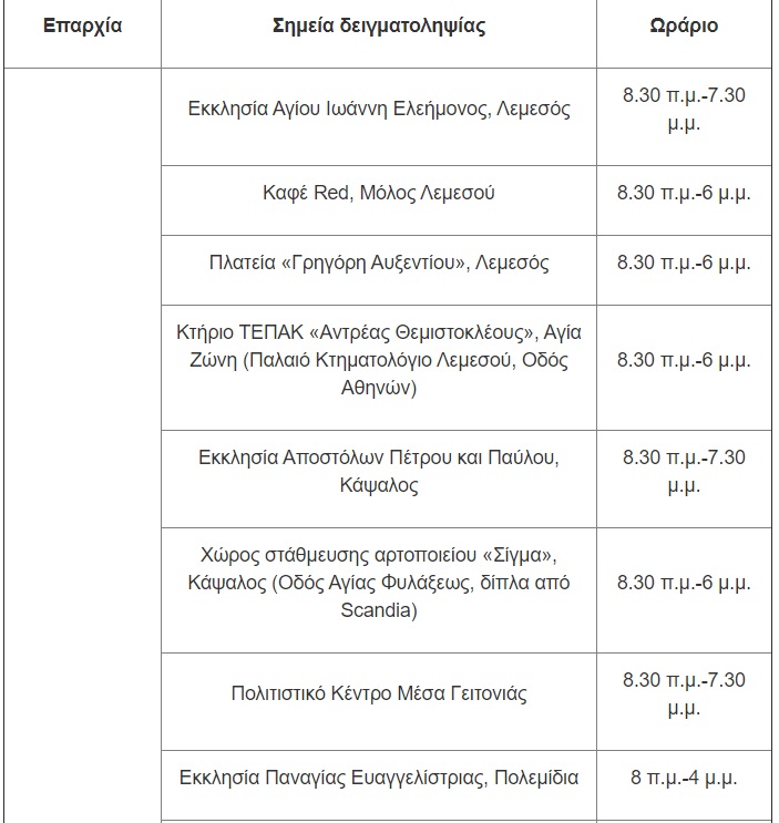Ως εκ τούτου, οι εργαζόμενοι μπορούν να προσέρχονται στα σημεία δειγματοληψίας που λειτουργούν σε όλες τις Επαρχίες, σύμφωνα με το πλάνο που καταρτίζει ο εργοδότης/προϊστάμενος. Για την Κυριακή, 4 Απριλίου, οι μονάδες δειγματοληψίας θα βρίσκονται στις ακόλουθες τοποθεσίες: