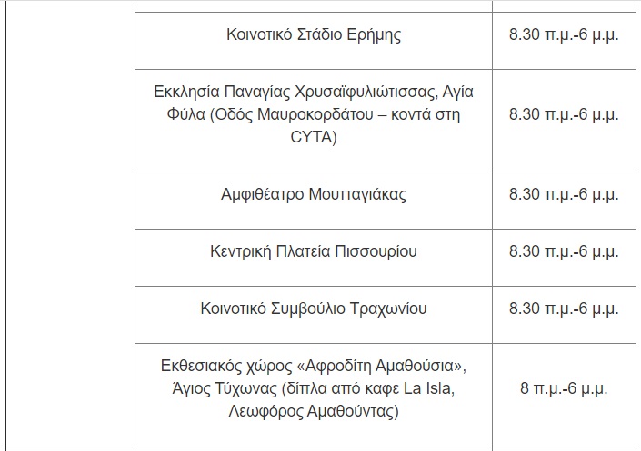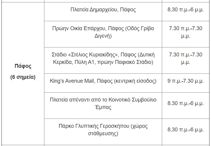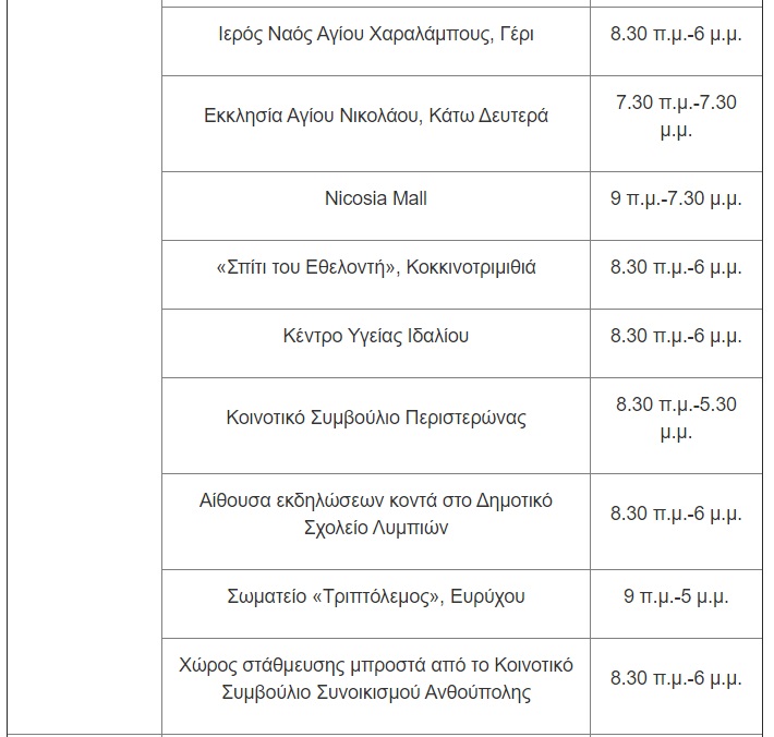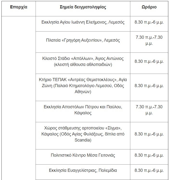 Για την Παρασκευή, 14 Μαΐου, οι μονάδες δειγματοληψίας θα βρίσκονται στις ακόλουθες τοποθεσίες: