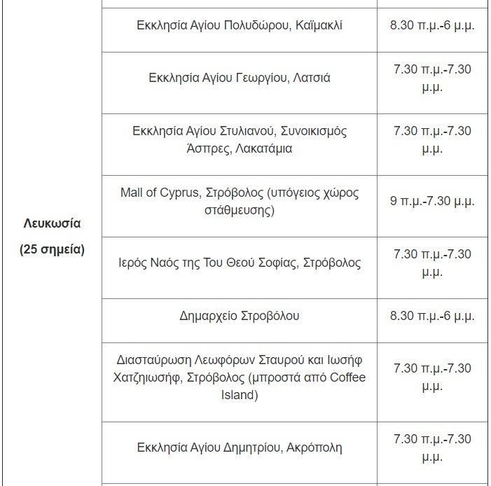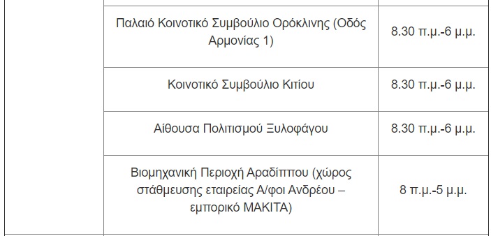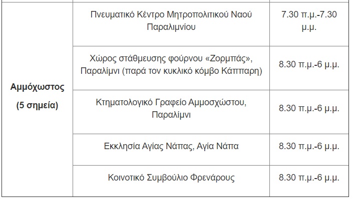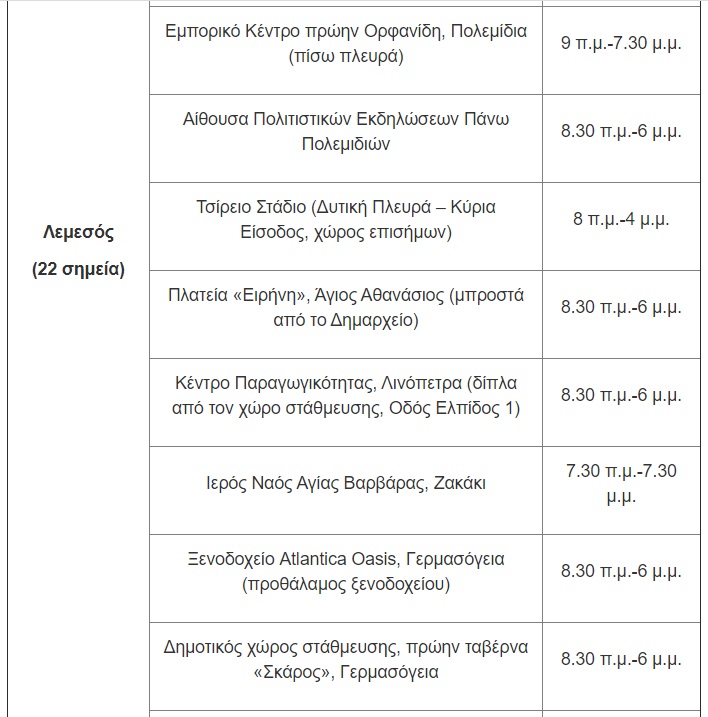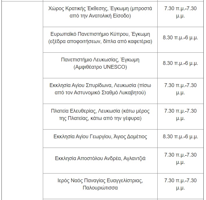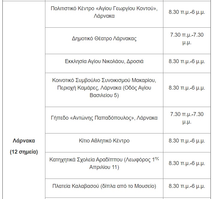 Για την Παρασκευή, 14 Μαΐου, οι μονάδες δειγματοληψίας θα βρίσκονται στις ακόλουθες τοποθεσίες: