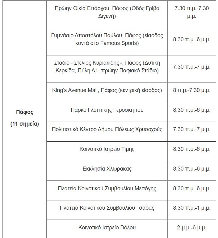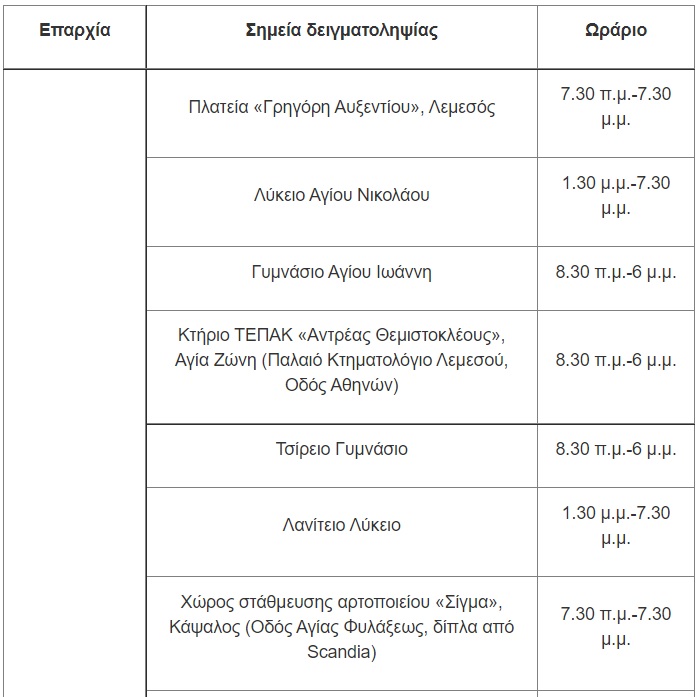 Για το Σάββατο, 5 Ιουνίου 2021, οι μονάδες δειγματοληψίας θα βρίσκονται στις ακόλουθες τοποθεσίες:
