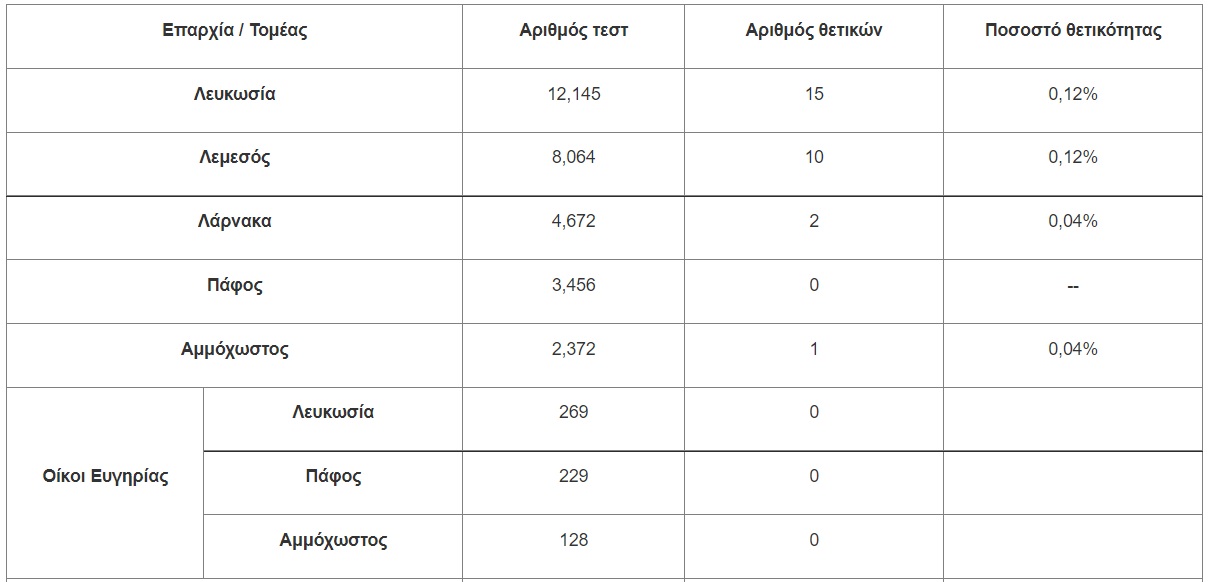 - 31 κρούσματα από 37,808 δείγματα που εξετάστηκαν με τη μέθοδο ταχείας ανίχνευσης αντιγόνου (antigen rapid test).