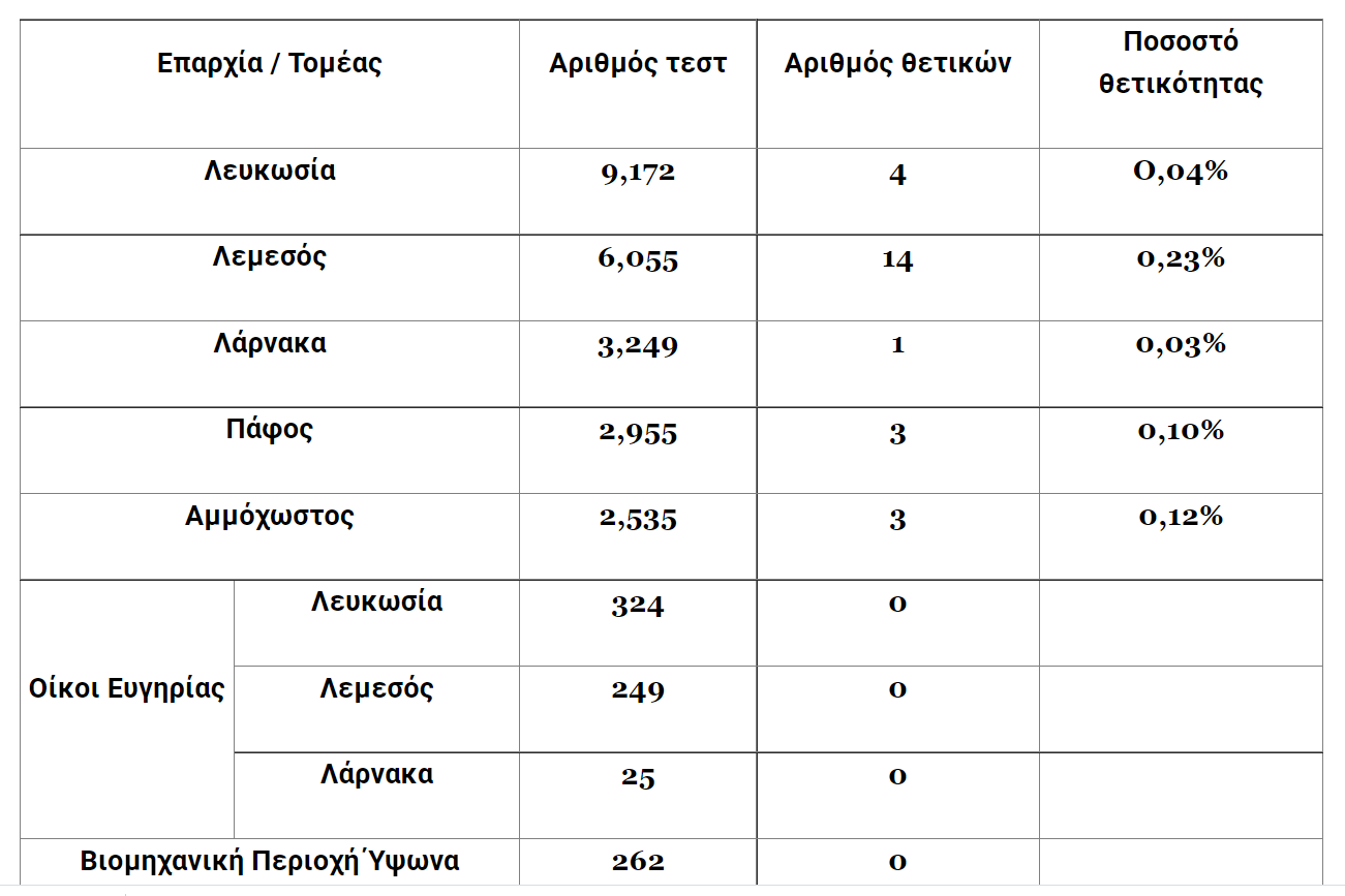 28 κρούσματα από 26,083 δείγματα που εξετάστηκαν με τη μέθοδο ταχείας ανίχνευσης αντιγόνου (antigen rapid test), ανακοίνωσε την Τετάρτη(16/06) το Υπουργείο Υγείας.