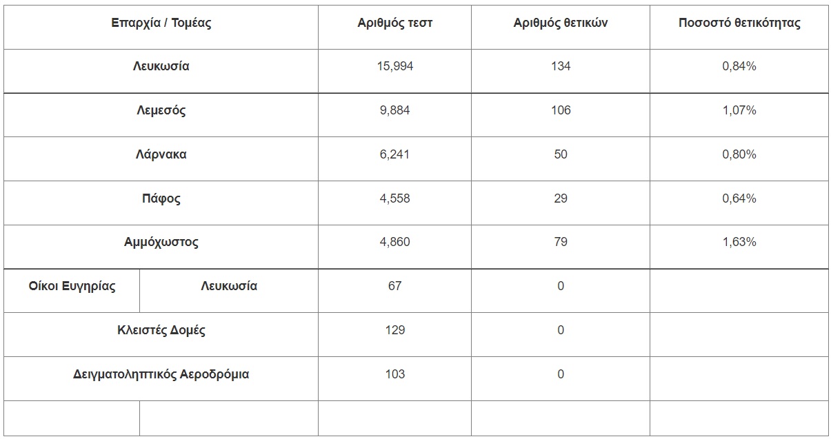 • 8 κρούσματα από 2,551 δείγματα που λήφθηκαν στο πλαίσιο ελέγχου επιβατών στα Αεροδρόμια Λάρνακας και Πάφου.