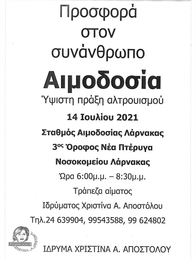 To Ίδρυμα Χριστίνας Α. Αποστόλου στη Λάρνακα, διοργανώνει αιμοδοσία αύριο Τετάρτη 14 Ιουλίου 2021, από τις 6:00μ.μ μέχρι και τις 8:30μ.μ., στο σταθμό Αιμοδοσίας Λάρνακας, στον 3ο όροφο της νέας πτέρυγας του Γενικού Νοσοκομείου Λάρνακας (είσοδος απέναντι από το εκκλησάκι), για τις ανάγκες της Τράπεζας Αίματος.
