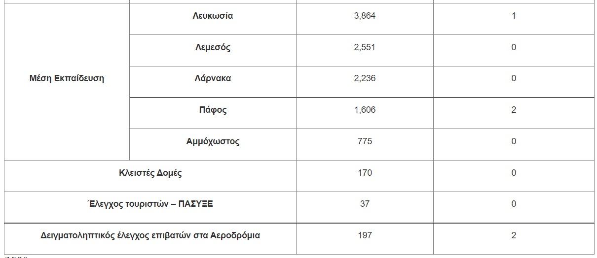 - 5 κρούσματα από 2,618 δείγματα που λήφθηκαν στο πλαίσιο ελέγχου επιβατών στα Αεροδρόμια Λάρνακας και Πάφου.