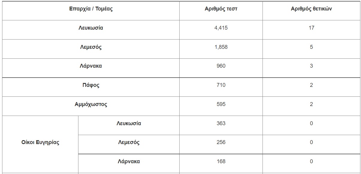 - 34 κρούσματα από 20,761 δείγματα που εξετάστηκαν με τη μέθοδο ταχείας ανίχνευσης αντιγόνου (antigen rapid test) μέσω του προγράμματος του Υπουργείου Υγείας.