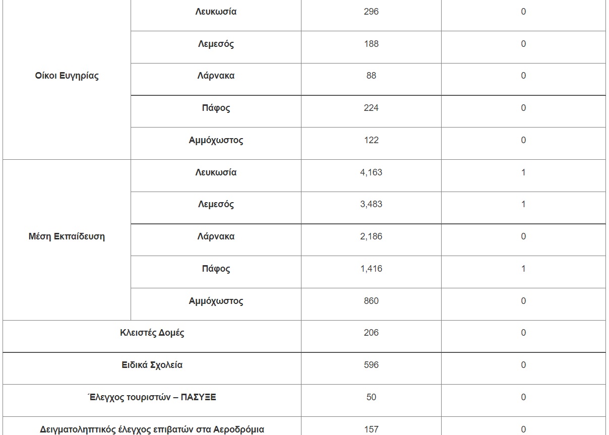 • 25 κρούσματα από 21,109 δείγματα που εξετάστηκαν με τη μέθοδο ταχείας ανίχνευσης αντιγόνου (antigen rapid test) μέσω του προγράμματος του Υπουργείου Υγείας.