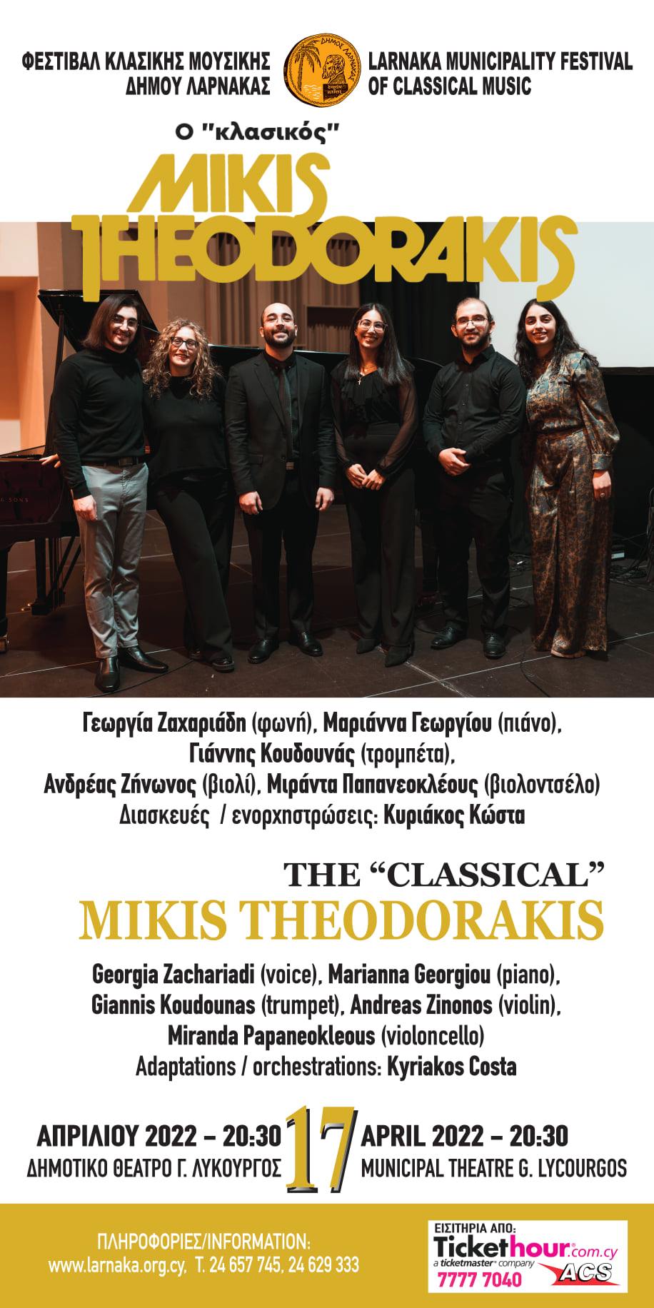 Την Κυριακή 17 Απριλίου στις 20:30 παρουσιάζεται η εκδήλωση «Ο κλασικός Μίκης Θεοδωράκης» στο Δημοτικό Θέατρο Λάρνακας Γ. Λυκούργος.