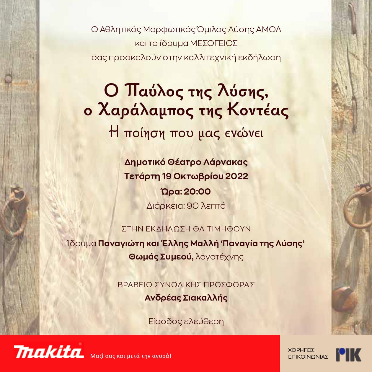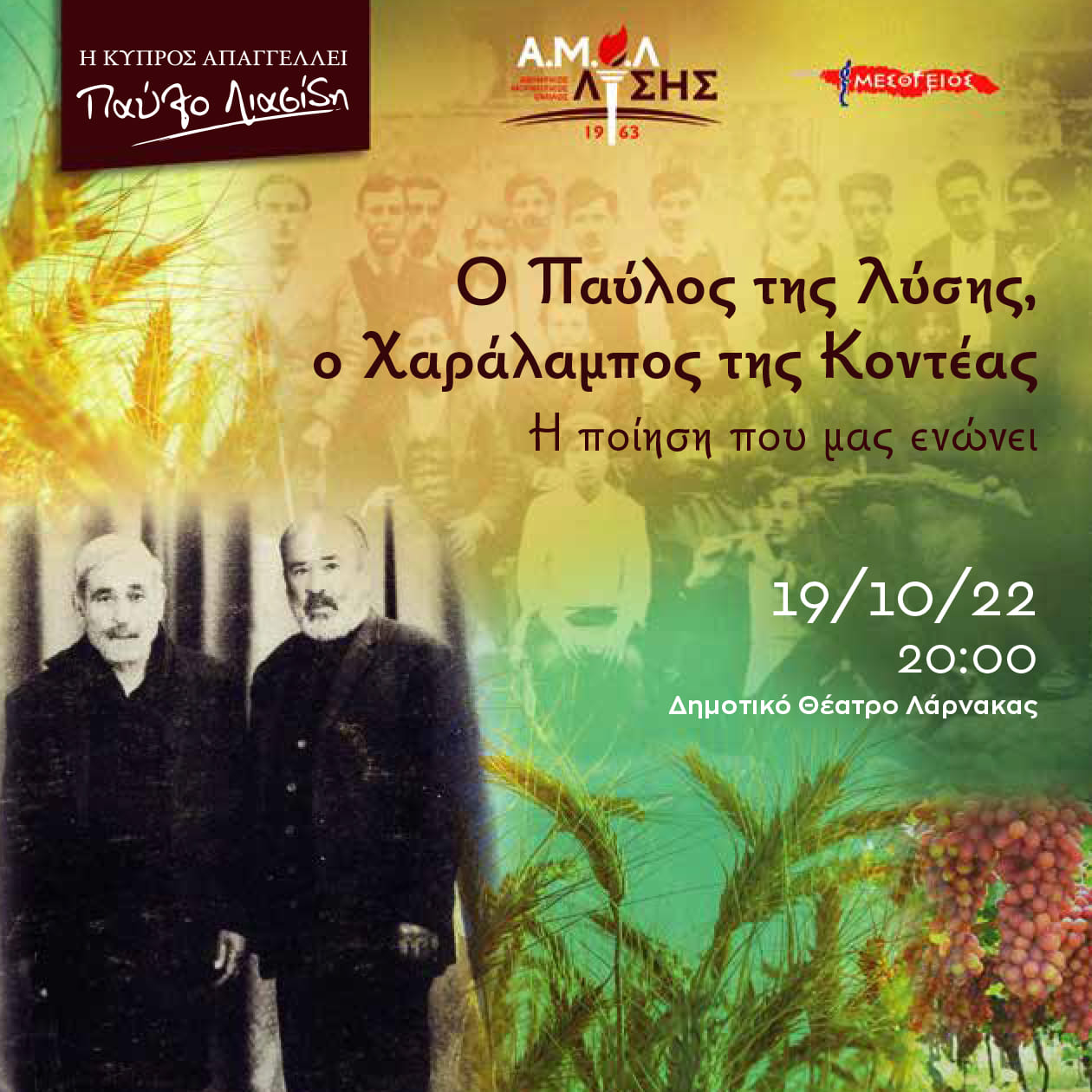 Την Τετάρτη 19 Οκτωβρίου στις 8:00 μ.μ. στο ΔΗΜΟΤΙΚΟ ΘΕΑΤΡΟ Γ. ΛΥΚΟΥΡΓΟΣ θα λάβει χώρα η Ποιητική βραδιά «Ο Παύλος της Λύσης, ο Χαράλαμπος της Κοντέας: η ποίηση ενώνει».