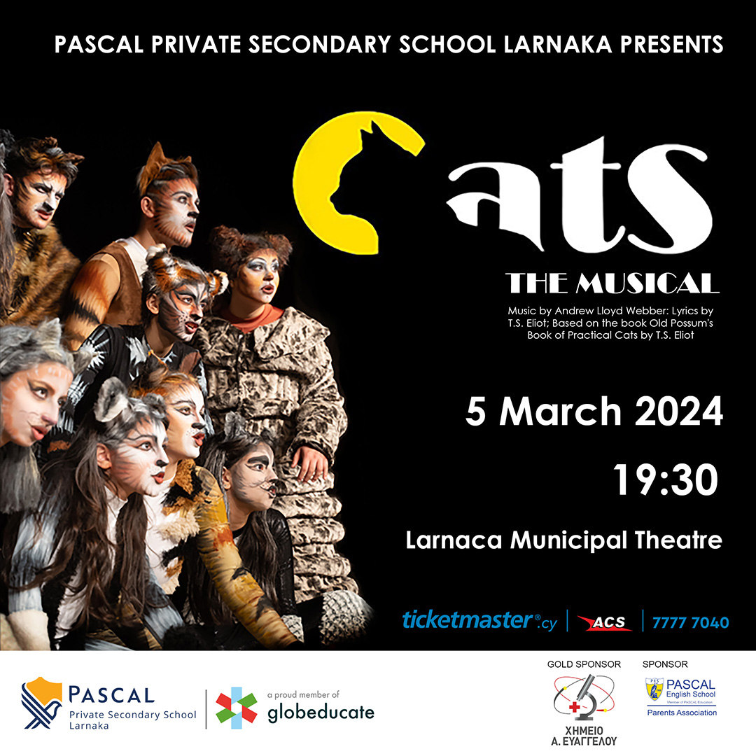 Οι μαθητές του PASCAL Secondary School Larnaka παρουσιάζουν με ιδιαίτερη χαρά και περηφάνια το αγαπημένο μιούζικαλ “Cats”, μια θεατρική εμπειρία που ξεπερνά κάθε προσδοκία.