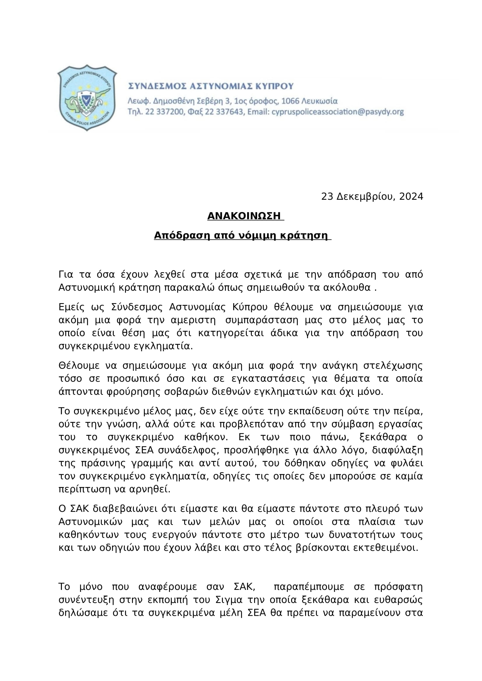 Με δισέλιδη ανακοίνωση ο Σύνδεσμος Αστυνομίας Κύπρου φέρνει στο «φως», τις συνθήκες κάτω από τις οποίες απέδρασε από κλινική της Λάρνακας, ο 49χρονος Σουηδός συλληφθέντας και καταζητούμενος από τις Αρχές της χώρας του για οικονομικές απάτες.