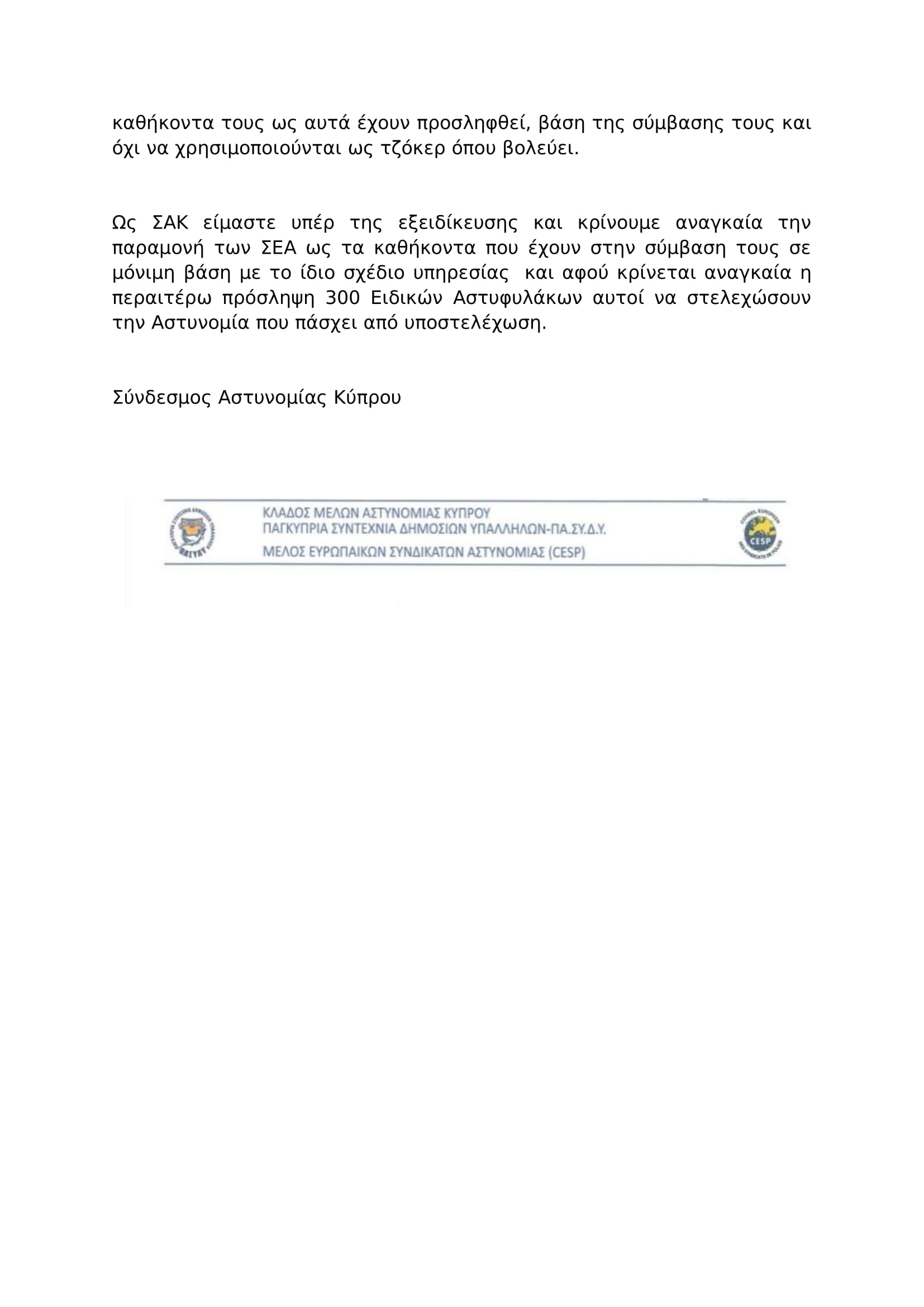Εκ των ποιο πάνω, ξεκάθαρα ο συγκεκριμένος ΣΕΑ συνάδελφος, προσλήφθηκε για άλλο λόγο, διαφύλαξη της πράσινης γραμμής και αντί αυτού, του δόθηκαν οδηγίες να φυλάει τον συγκεκριμένο εγκληματία, οδηγίες τις οποίες δεν μπορούσε σε καμία περίπτωση να αρνηθεί.»