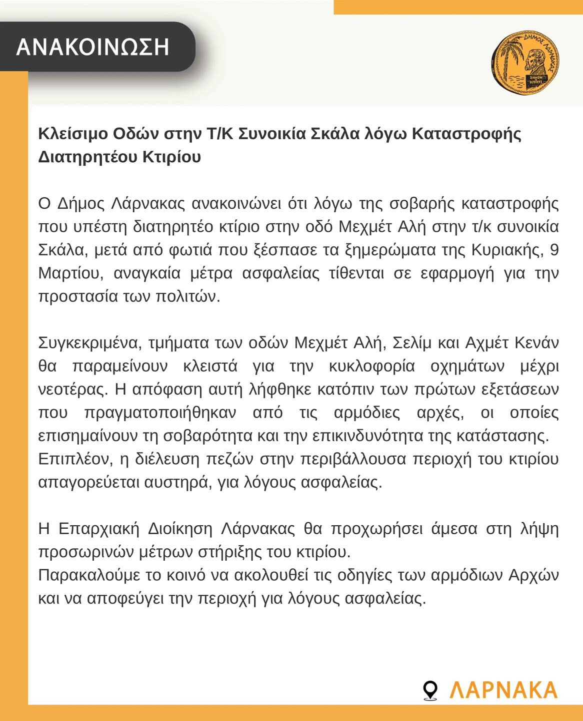 «Συγκεκριμένα, τμήματα των οδών Μεχμέτ Αλή, Σελίμ και Αχμέτ Κενάν θα παραμείνουν κλειστά για την κυκλοφορία οχημάτων μέχρι νεοτέρας. Η απόφαση λήφθηκε κατόπιν των πρώτων εξετάσεων που πραγματοποιήθηκαν από τις αρμόδιες αρχές, οι οποίες επισημαίνουν τη σοβαρότητα και την επικινδυνότητα της κατάστασης. Επιπλέον, η διέλευση πεζών στην περιβάλλουσα περιοχή του κτηρίου απαγορεύεται αυστηρά, για λόγους ασφαλείας.»