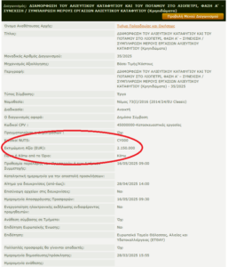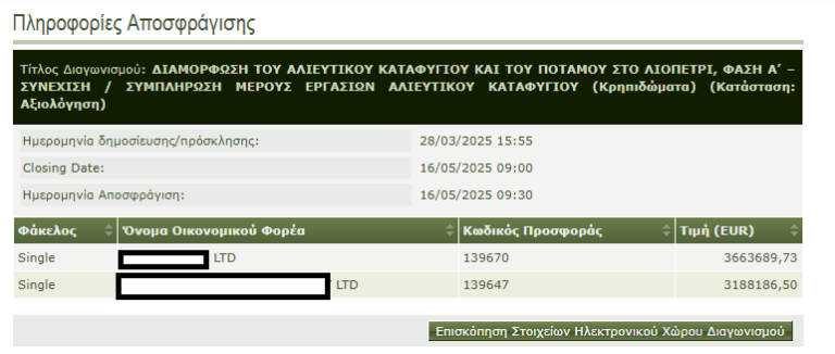 Σύμφωνα με τα αποτελέσματα του διαγωνισμού, υποβλήθηκαν δύο προσφορές από αντίστοιχο αριθμό εταιρειών με την χαμηλότερη στα €3,188,186. Σημειώνεται ότι ο προκάτοχος του έργου είχε προϋπολογίσει τις τιμές για την εκτέλεση των συγκεκριμένων εργασιών, οι οποίος περιλαμβάνονταν στο επίμαχο συμβόλαιο και ανέρχονταν στα €1,487,858