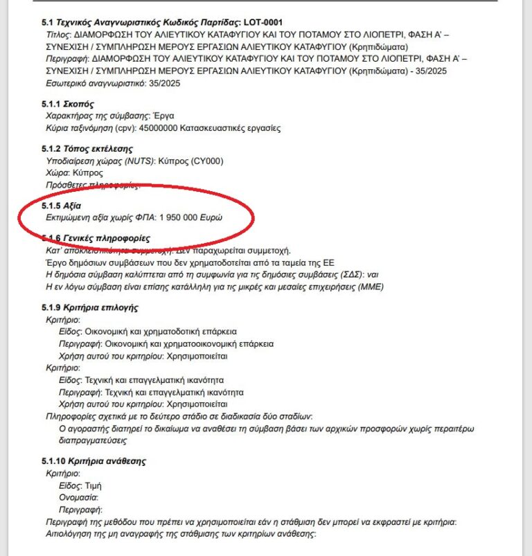 O λόγος; Στην επαναπροκήρυξη του διαγωνισμού για την πρώτη φάση του έργου, που αφορά στην ανέγερση κρηπιδωμάτων και την εκτέλεση εργασιών για το αλιευτικό καταφύγιο, ο αρχικός προυπολογισμός της προκήρυξης προσφοράς για τη συμπλήρωση από νέο εργολάβο ήταν €1,950,000. Εντούτοις, κατά την διάρκεια της προσφοράς, ο προυπολογισμός φαίνεται να άλλαξε και να αυξήθηκε στα €2,150,000.