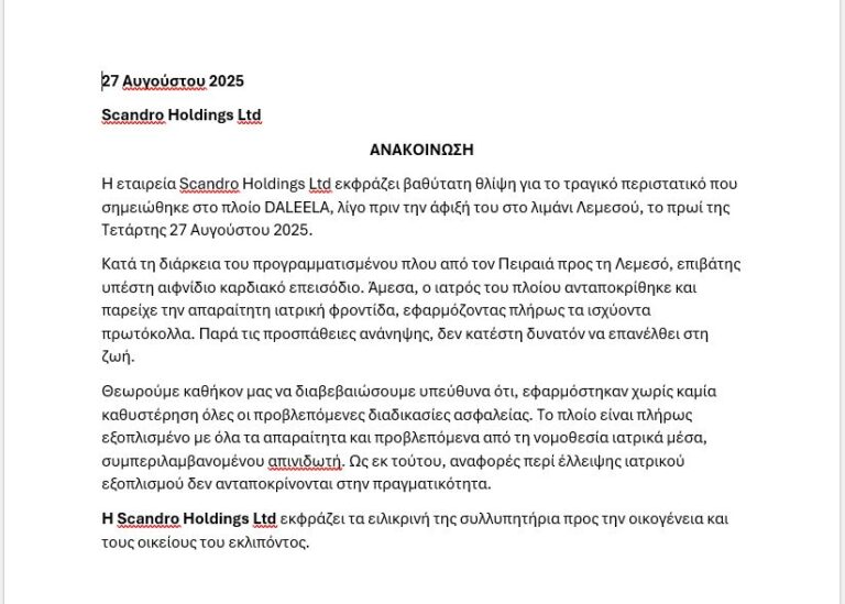 Bαθύτατη θλίψη για τον θάνατο του 56χρονου Ελλαδίτη, μόνιμου κατοίκου Κύπρου, κατά το δρομολόγιο Πειραιάς – Λεμεσός, με το πλοίο «DALEELA», λίγο πριν την άφιξή του στο λιμάνι Λεμεσού το πρωί της Τετάρτης 27 Αυγούστου 2025, εκφράζει η ιδιοκτήτρια εταιρεία Scandro Holdings Ltd.