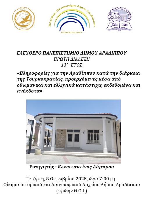 Εισηγητής: Κωνσταντίνος Λάμπρου,Εκπαιδευτικός – Ερευνητής – Συγγραφέας, την Τετάρτη, 8 Οκτωβρίου 2025 και ώρα 7:00 μ.μ. στο Οίκημα Ιστορικού και Λαογραφικού Αρχείου Δήμου Αραδίππου (πρώην Θ.Ο.Ι.).