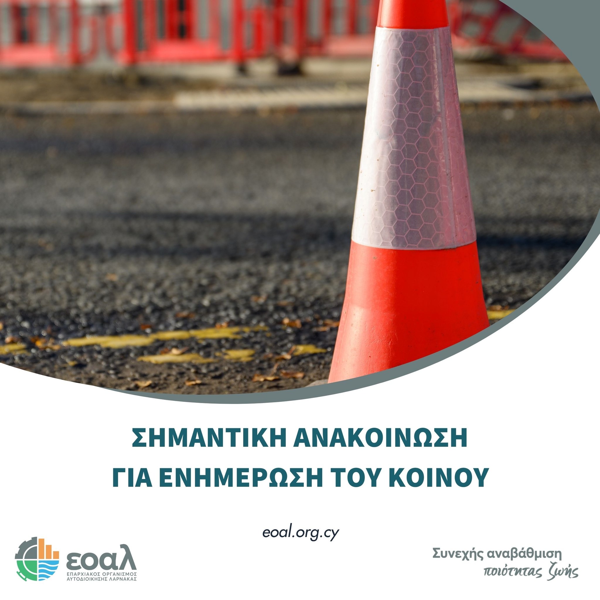 Διευκρινίζεται ότι πριν το κλείσιμο των δρόμων ή εκτέλεση εργασιών σε αυτούς, εξασφαλίζεται η ενυπόγραφη έγκριση της Τροχαίας, των αρμόδιων Δημοτικών/Κοινοτικών Αρχών και του Μηχανικού, αφού τα μέτρα κυκλοφοριακής διαχείρισης καθορίζονται/υποδεικνύονται από την Αστυνομία σε συνεννόηση με τις Τοπικές Αρχές και εφαρμόζονται από τον ΕΟΑ Λάρνακας στα πλαίσια υλοποίησης των σχετικών έργων.