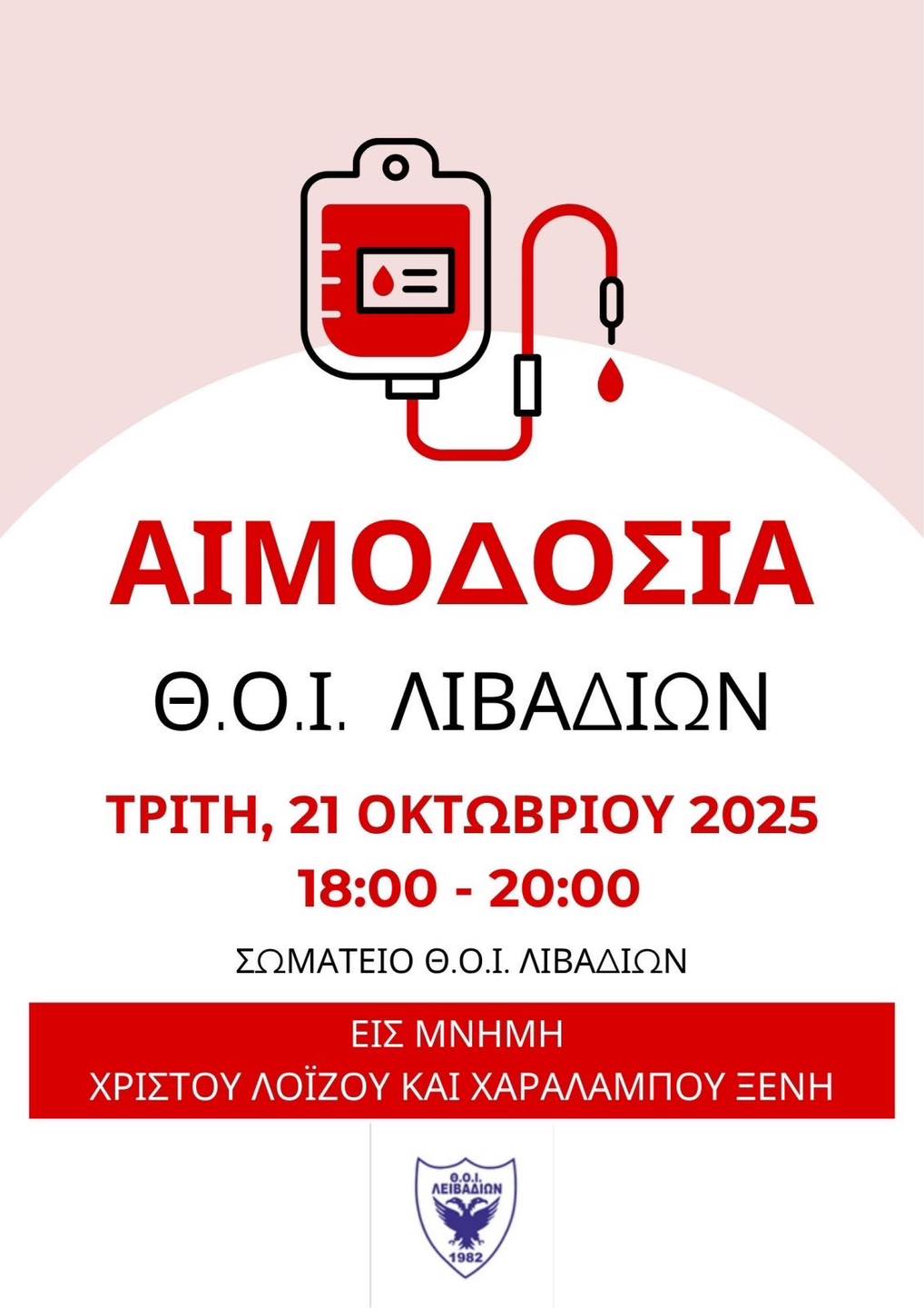 Το Σωματείο ΘΟΙ Λιβαδιών θα πραγματοποιήσει την Τρίτη 21 Οκτωβρίου 2025 από τις 6.00 μ.μ. μέχρι και τις 8.00 μ.μ. Αιμοδοσία εις μνήμη του Χρίστου Λοϊζου και Χαράλαμπου Ξενή για τις ανάγκες της Τράπεζας Αίματος του Γενικού Νοσοκομείου Λάρνακας.