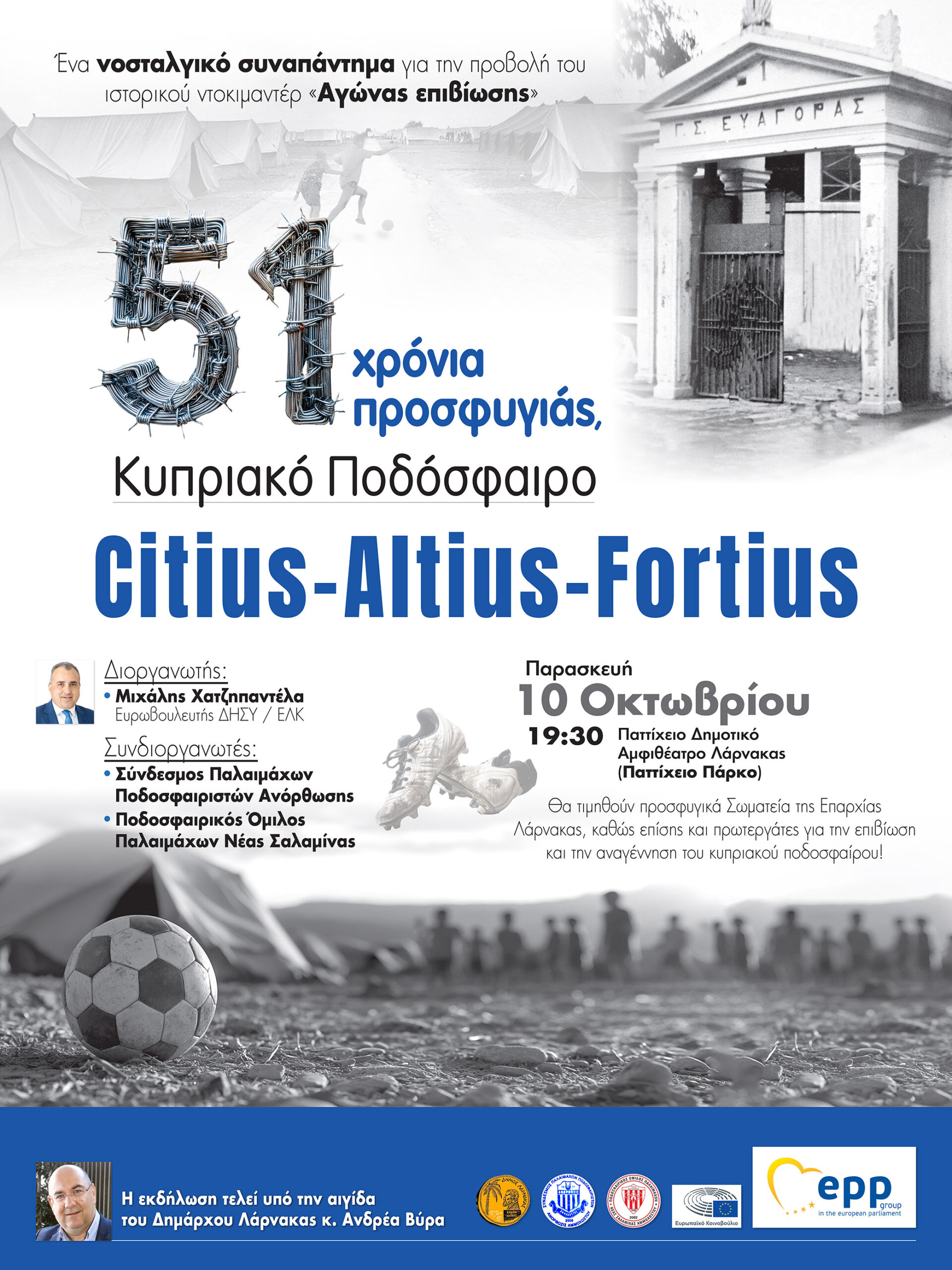Η Λάρνακα είναι ο επόμενος μεγάλος σταθμός της εκδήλωσης «51 Χρόνια Προσφυγιάς, Κυπριακό Ποδόσφαιρο: Citius – Altius – Fortius». Θα διοργανωθεί την Παρασκευή 10 Οκτωβρίου, η ώρα 19:30, στο Παττίχειο Δημοτικό Αμφιθέατρο Λάρνακας (Παττίχειο Πάρκο). Είναι μια πρωτοβουλία του Ευρωβουλευτή του Δημοκρατικού Συναγερμού και του Ευρωπαϊκού Λαϊκού Κόμματος, Μιχάλη Χατζηπαντέλα, η οποία άρχισε από τις Βρυξέλλες και συνεχίστηκε στη Δερύνεια, στη Λευκωσία και στην Αθηένου. Στη Λάρνακα, συνδιοργανωτές είναι οι σύνδεσμοι Παλαιμάχων Ποδοσφαιριστών της Ανόρθωσης και της Νέας Σαλαμίνας, ενώ τελεί υπό την αιγίδα του Δημάρχου Λάρνακας, Ανδρέα Βύρα.