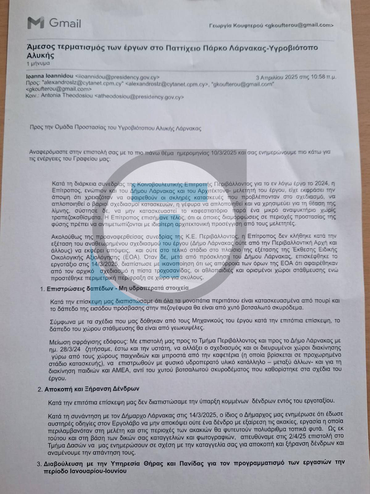 Στην επιστολή σημειώνεται ακόμη ότι οι πιο πάνω παρατηρήσεις διαβιβάστηκαν τόσο στο Δήμο Λάρνακας όσο και στο Τμήμα Περιβάλλοντος, με την επισήμανση ότι οι εργασίες στο Παττίχειο Πάρκο πρέπει να συμμορφωθούν με τις περιβαλλοντικές πρόνοιες και να αποφευχθούν περαιτέρω επιπτώσεις στο οικοσύστημα του Υγροβιότοπου Αλυκής.