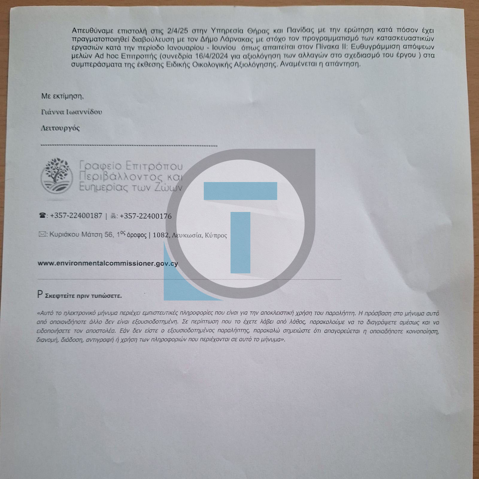 Όπως αναφέρεται στην επιστολή, κατά τη διάρκεια της Κοινοβουλευτικής Επιτροπής Περιβάλλοντος για το εν λόγω έργο το 2024, η Επίτροπος ενώπιον και του Δήμου Λάρνακας και του Αρχιτέκτονα μελετητή του έργου, είχε εκφράσει την άποψη ότι χρειαζόταν να αφαιρεθούν οι σκληρές κατασκευές που προβλέπονταν στον σχεδιασμό, να απλοποιηθούν οι βαριοί σχεδιασμοί κατασκευών, η γέφυρα να απλοποιηθεί και να χρησιμεύει για τη θέαση της λίμνης.