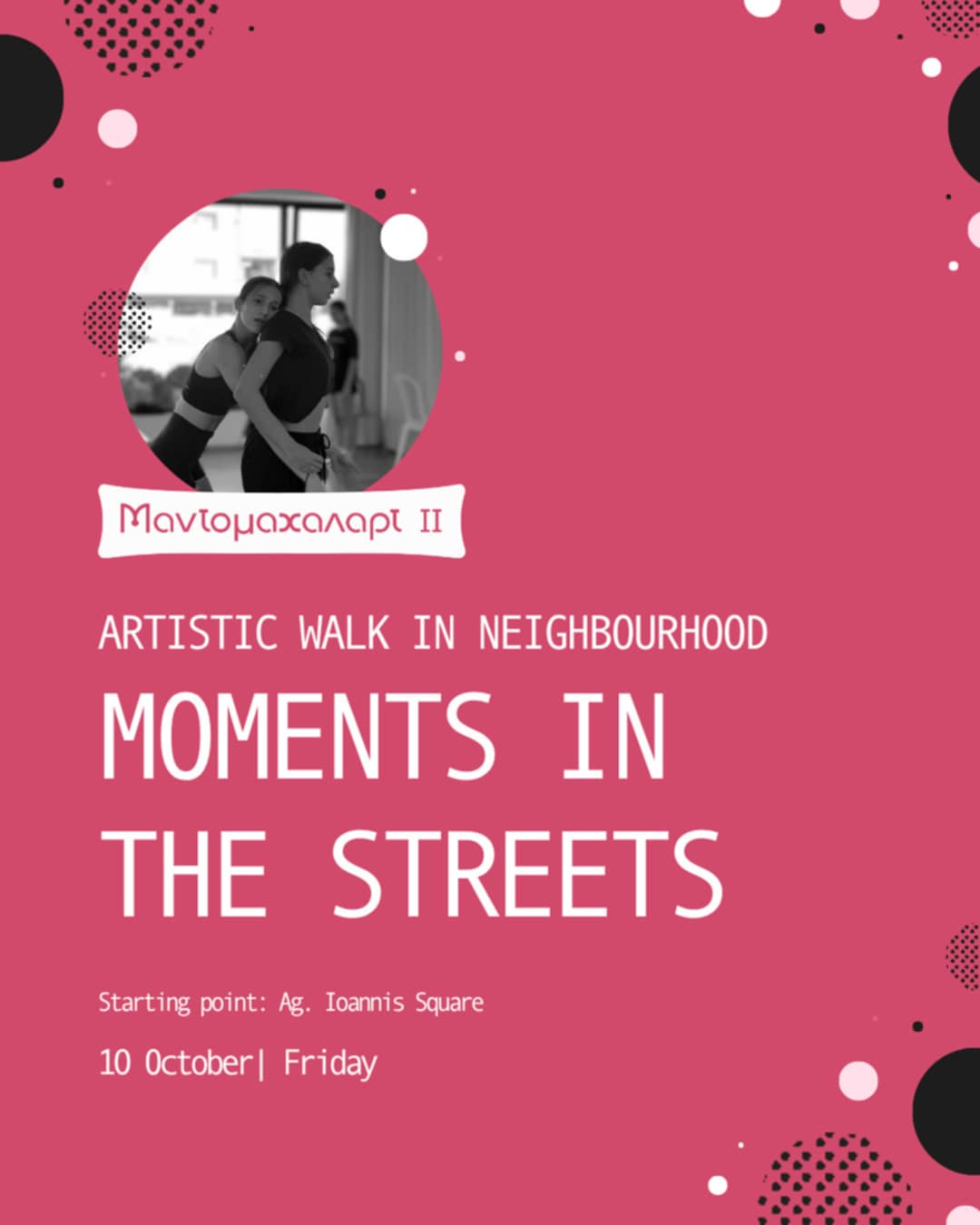 Σήμερα Παρασκευή (10/10), από τις 7μ.μ., θα γίνουν τρεις καλλιτεχνικοί περίπατοι με τίτλο «Στιγμές στο δρόμο». Θα πραγματοποιηθούν τρεις περίπατοι ανά μισή ώρα με σημείο εκκίνησης την πλατεία Αγίου Ιωάννη. Μέσα από τη διαδρομή, οι δρόμοι θα γεμίσουν μουσική, θέατρο, χορό, ποίηση, φωτογραφία και έργα τέχνης.