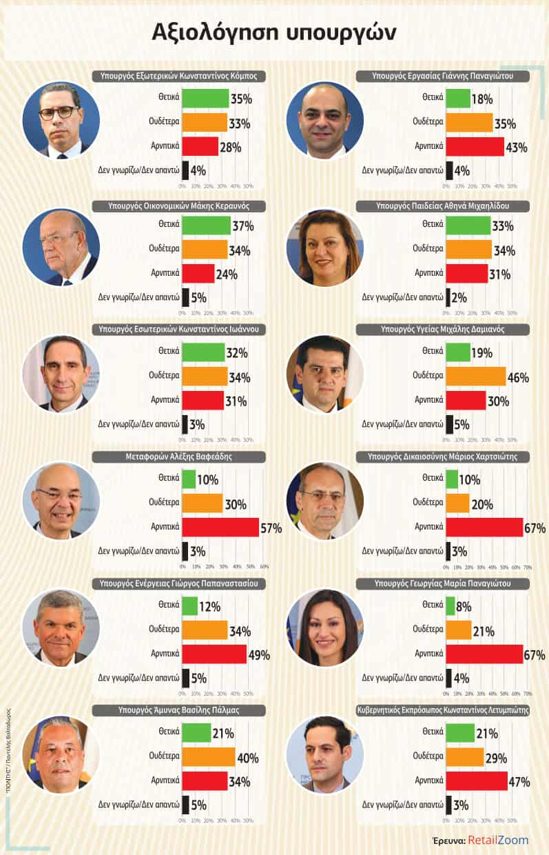 Η αξιολόγηση των πολιτών για το έργο των υπουργών δείχνει ότι η αποτυχία στη διαχείριση κρίσεων και προβλημάτων της καθημερινότητας τούς καθιστά έντονα αντιδημοφιλείς. Συνολικά, η κοινή γνώμη δεν αποτιμά θετικά το έργο των υπουργών της κυβέρνησης Χριστοδουλίδη, καθώς κανένας υπουργός της κυβέρνησης δεν απέσπασε θετικές κρίσεις πέραν του 50%. Υπό τις συνθήκες αξιοπρόσεκτα προσοστά θετικής αξιολόγησης έχουν ο υπουργός Οικονομικών Μάκης Κεραυνός με 37%, ο υπουργός Εξωτερικών Κωνσταντίνος Κόμπος με 35%, η υπουργός Παιδείας Αθηνά Μιχαηλίδου με 33% και ο υπουργός Εσωτερικών Κωνσταντίνος Ιωάννου με 32%. Έπονται με 21% ο υπουργός Άμυνας Βασίλης Πάλμας και ο κυβερνητικός εκπρόσωπος Κωνσταντίνος Λετυμπιώτης. Οι υπουργοί Γεωργίας και Δικαιοσύνης, που κρίθηκαν ανεπαρκείς σε ό,τι αφορά την πυρκαγιά του Αυγούστου, πήραν πολύ χαμηλά ποσοστά, ενώ και οι υπουργοί που έπρεπε να λύσουν σοβαρά προβλήματα, όπως ο Συγκοινωνιών (Takata) και ο Εμπορίου (τερματικό στο Βασιλικό, κόστος ενέργειας), δεν ικανοποίησαν και πήραν πολύ χαμηλή βαθμολογία.