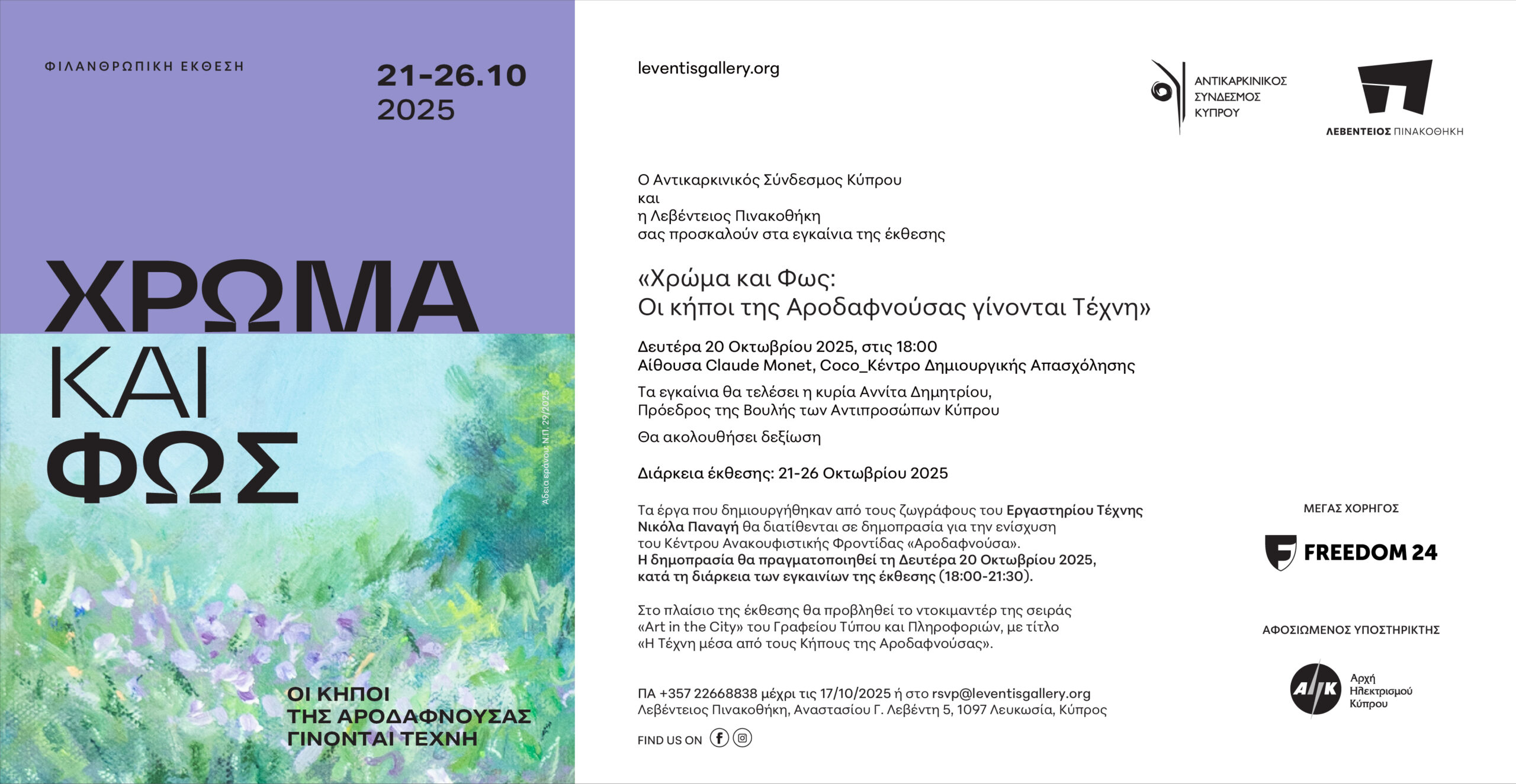 Ο Αντικαρκινικός Σύνδεσμος Κύπρου και η Λεβέντειος Πινακοθήκη παρουσιάζουν την έκθεση «Χρώμα και Φως: Οι κήποι της Αροδαφνούσας γίνονται Τέχνη», μια ξεχωριστή πρωτοβουλία που ενώνει τον κόσμο της τέχνης με αυτόν της προσφοράς.