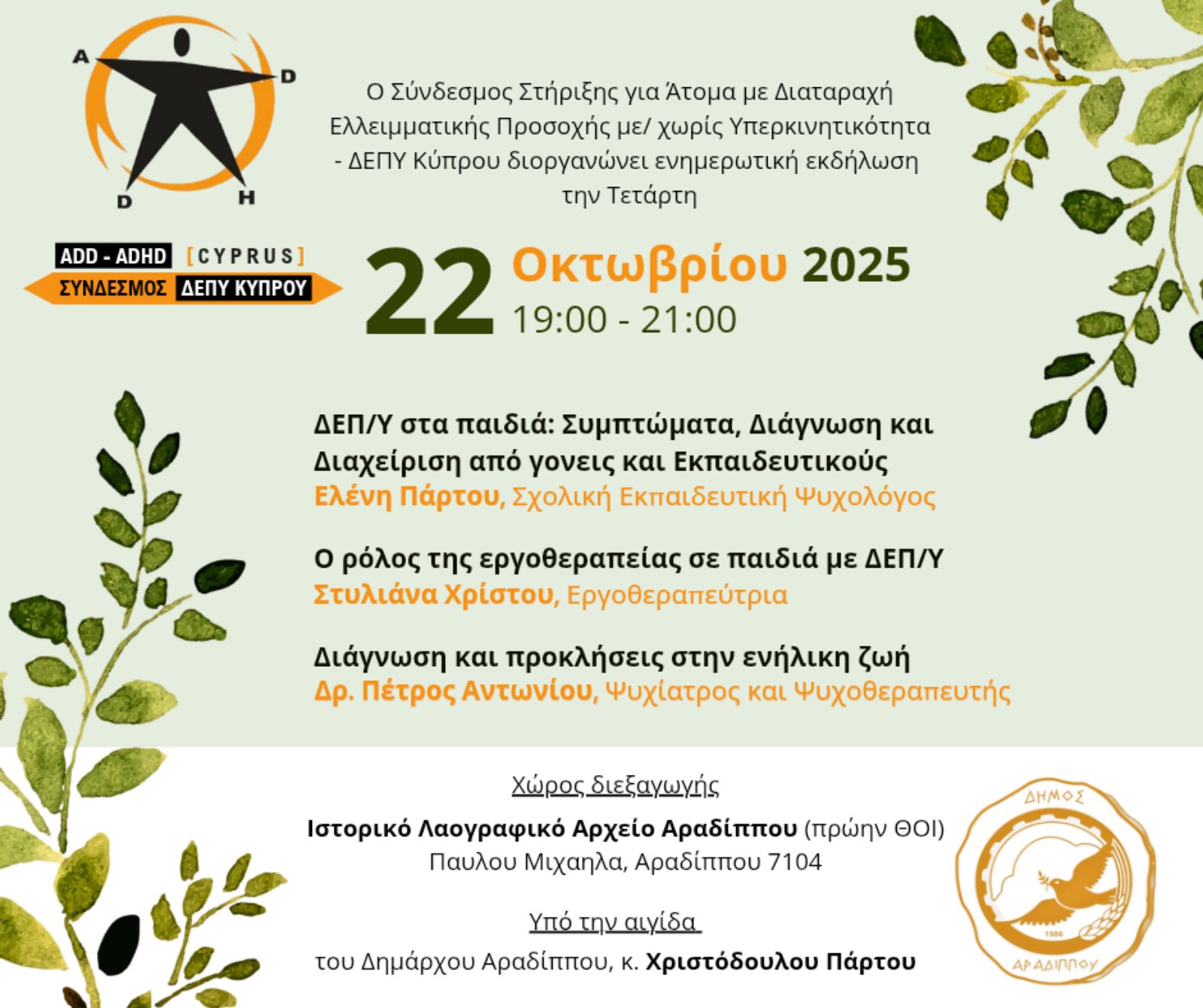 Ο Σύνδεσμος Στήριξης για Άτομα με Διαταραχή Ελλειμματικής Προσοχής με/χωρίς Υπερκινητικότητα – ΔΕΠΥ Κύπρου, σας προσκαλεί σε μια σημαντική εκδήλωση ενημέρωσης και ευαισθητοποίησης για τη ΔΕΠΥ σε παιδιά και ενήλικες, την Τετάρτη, 22 Οκτωβρίου 2025 από τις 19:00 – 21:00, στο Ιστορικό Λαογραφικό Αρχείο Αραδίππου (πρώην ΘΟΙ) Πάυλου Μιχαήλ, Αραδίππου 7104.