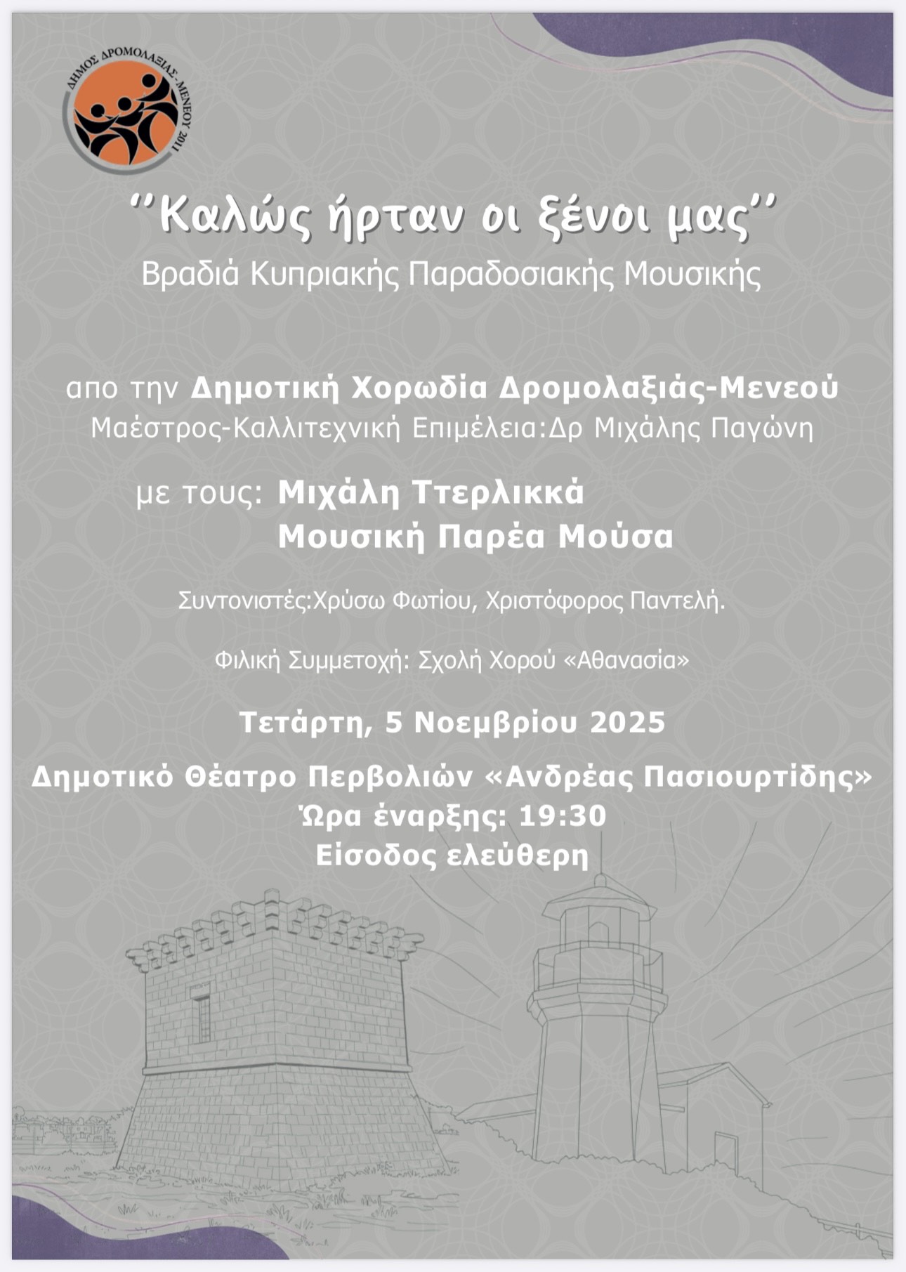 Ο Δήμος Δρομολαξιάς – Μενεού και η Δημοτική Χορωδία Δρομολαξιάς–Μενεού, σας προσκαλούν σε μια ξεχωριστή μουσική βραδιά αφιερωμένη στην κυπριακή παράδοση, την Τετάρτη, 5 Νοεμβρίου 2025 και ώρα 7.30 μ. μ, στο Δημοτικό Θέατρο Περβολιών «Ανδρέας Πασιουρτίδης».