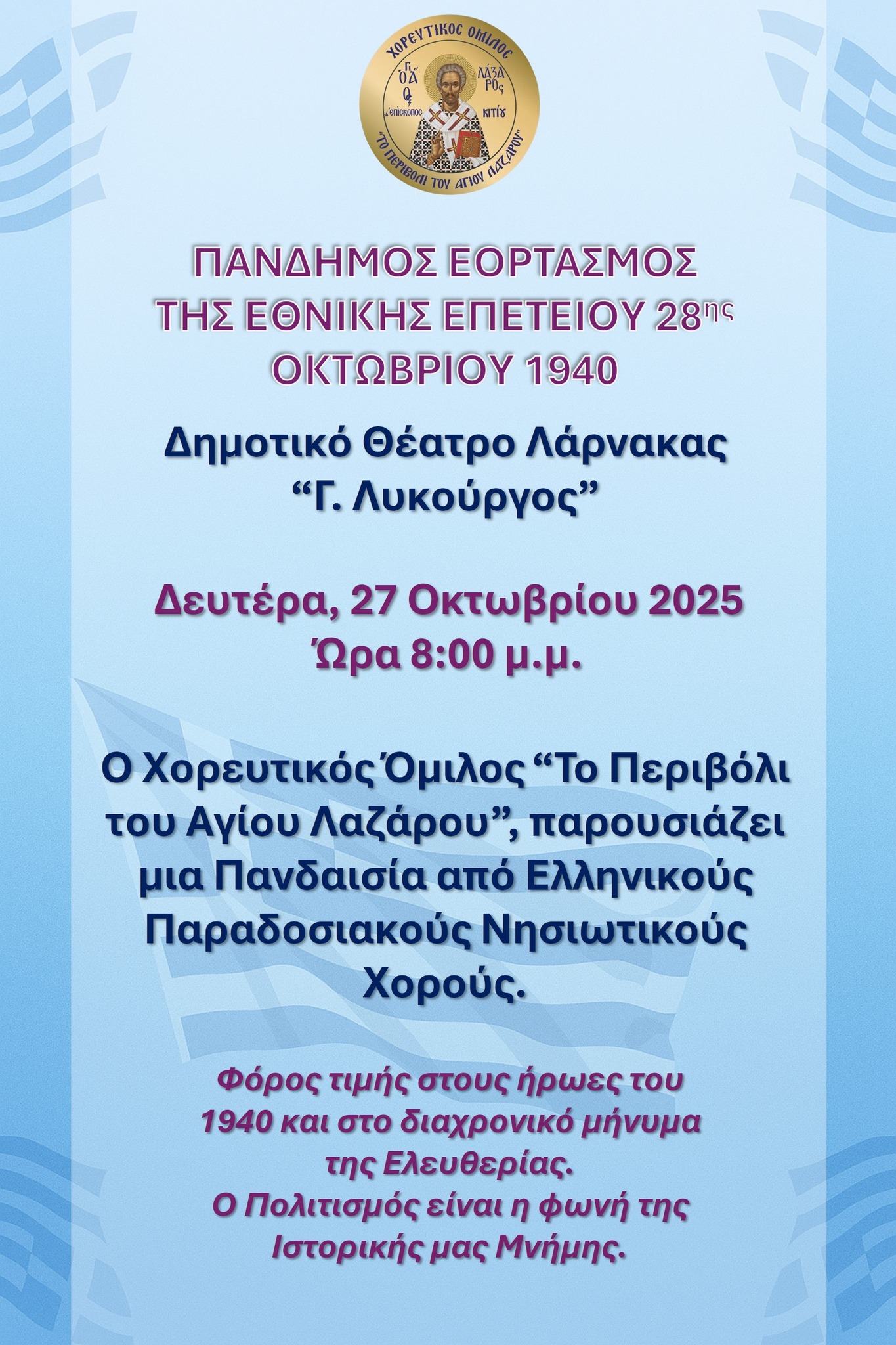 Ο Χορευτικός Όμιλος “Το Περιβόλι του Αγίου Λαζάρου”, συμμετέχει με τιμή στον Πανδήμο Εορτασμό της Εθνικής Επετείου της 28ης Οκτωβρίου 1940, που θα πραγματοποιηθεί τη Δευτέρα, 27 Οκτωβρίου 2025, στις 8:00 μ.μ., στο Δημοτικό Θέατρο Λάρνακας “Γ. Λυκούργος.”