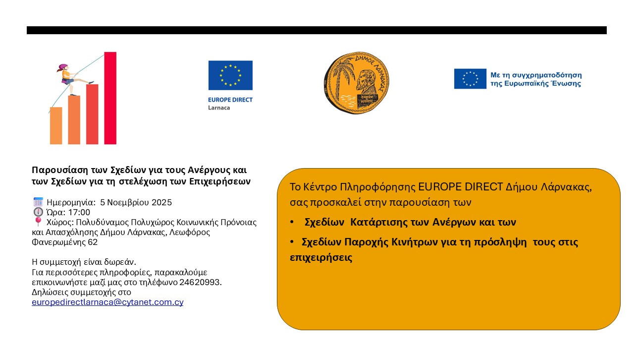 Το Κέντρο Πληροφόρησης EUROPE DIRECT Δήμου Λάρνακας, σας προσκαλεί στη παρουσίαση των Σχεδίων Χορηγιών για Ανέργους και των Σχεδίων Παροχής Κινήτρων για την Πρόσληψη τους, την Τετάρτη, 5 Νοεμβρίου 2025, στις 5:00 το απόγευμα.