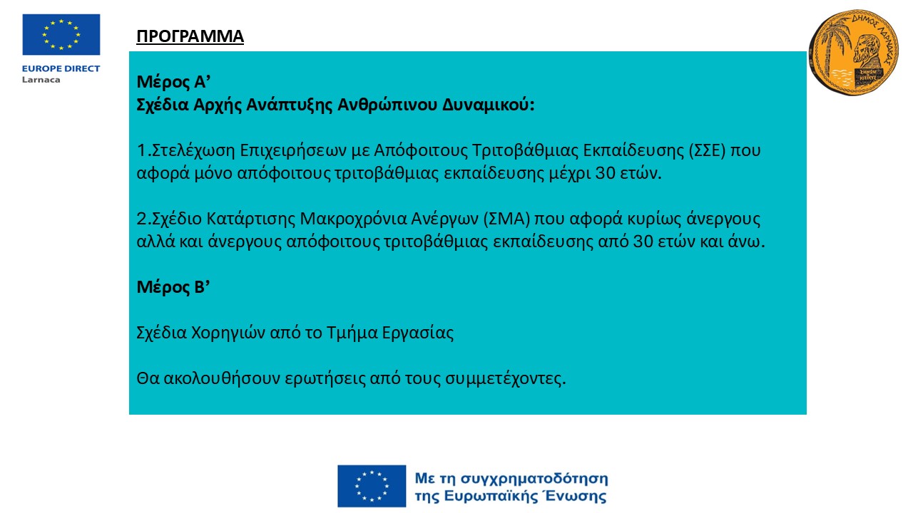 EUROPE DIRECT Δήμου Λάρνακας: Παρουσίαση Σχεδίων Χορηγιών για Ανέργους και των Σχεδίων Παροχής Κινήτρων για την Πρόσληψη τους