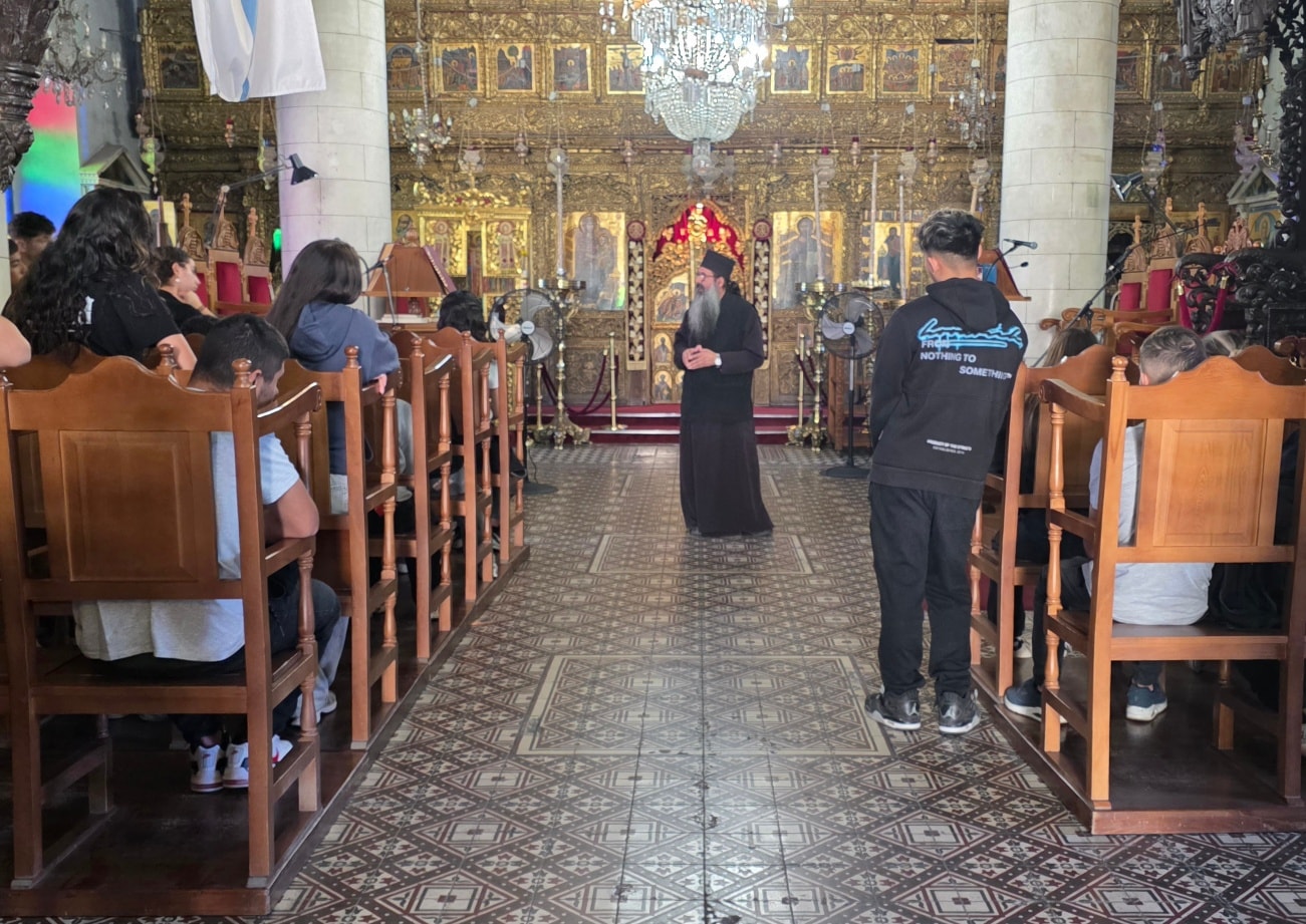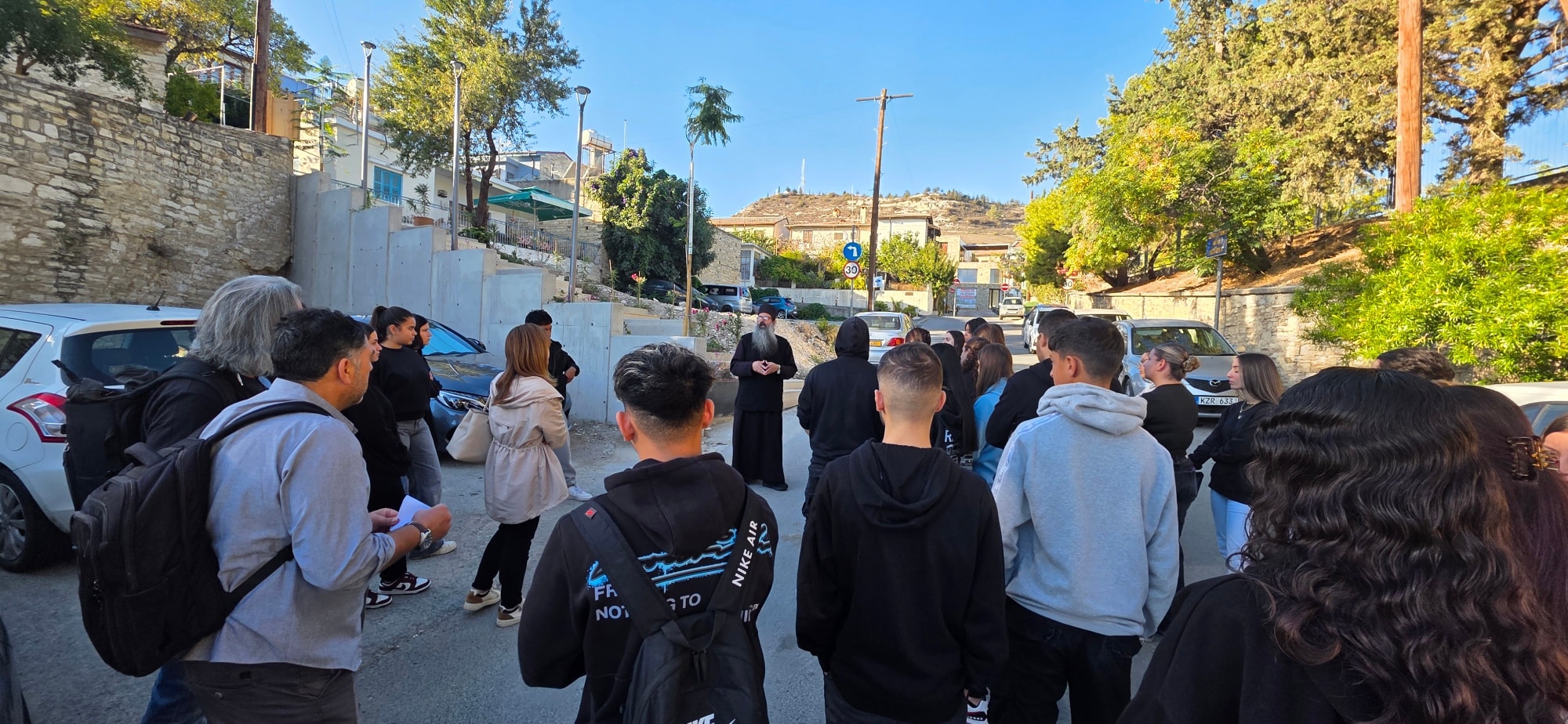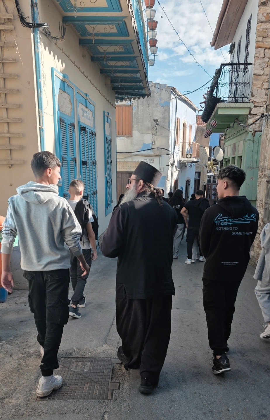 Ο Πατέρας Χριστομάριος αφιέρωσε από τον χρόνο του και, με αγάπη και εγκαρδιότητα, καθοδήγησε τους μαθητές μας μέσα από τα γραφικά σοκάκια του χωριού, προσφέροντάς τους μια ζεστή φιλοξενία.