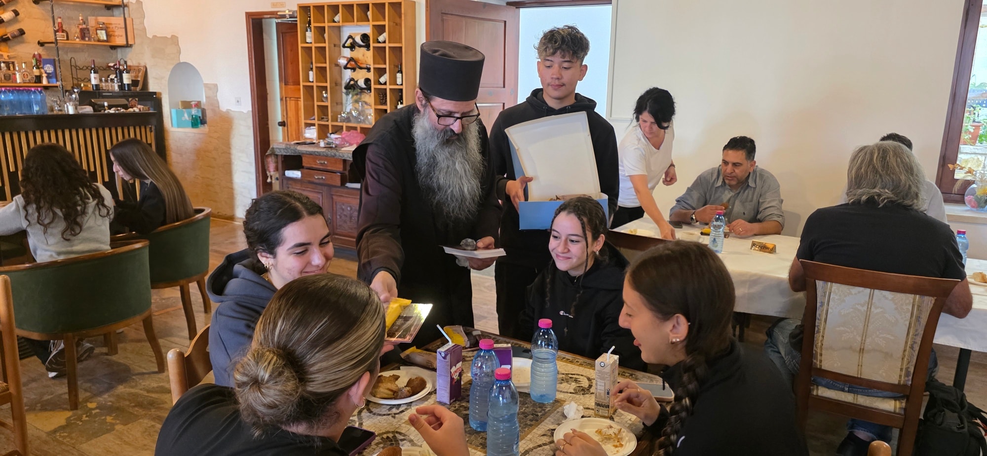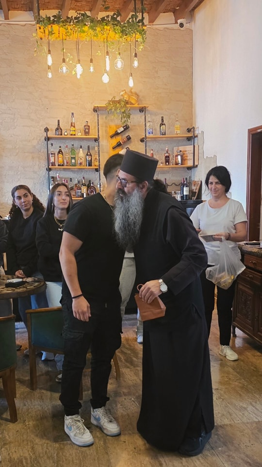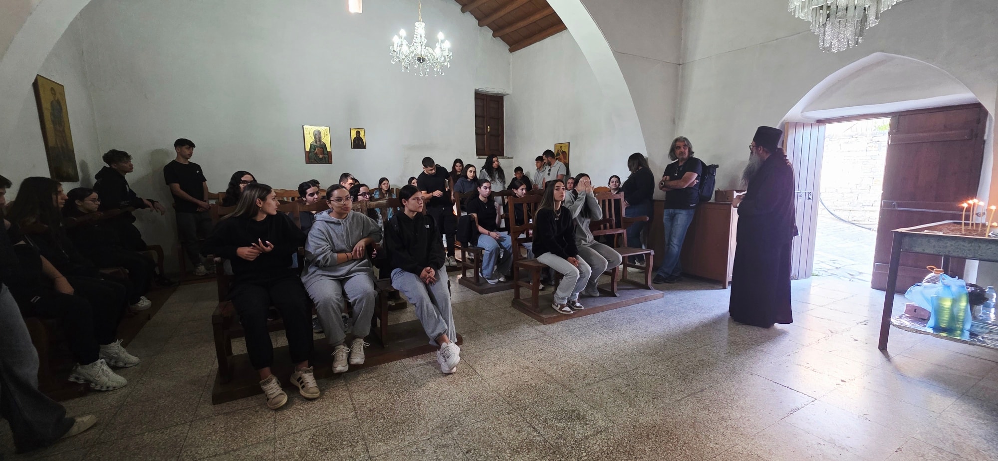 Ο Πατέρας Χριστομάριος αφιέρωσε από τον χρόνο του και, με αγάπη και εγκαρδιότητα, καθοδήγησε τους μαθητές μας μέσα από τα γραφικά σοκάκια του χωριού, προσφέροντάς τους μια ζεστή φιλοξενία.