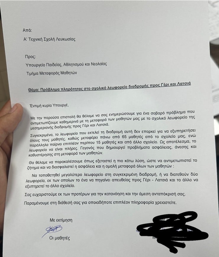 Zήτημα υπερπληρότητας σε σχολικό λεωφορείο που εκτελεί τη μεσημεριανή διαδρομή προς Γέρι και Λατσιά, καταγγέλλουν μαθητές της Α’ Τεχνικής Σχολής Λευκωσίας, με επιστολή που απέστειλαν στο Υπουργείο Παιδείας και ειδικότερα στο Τμήμα Μεταφοράς Μαθητών.
