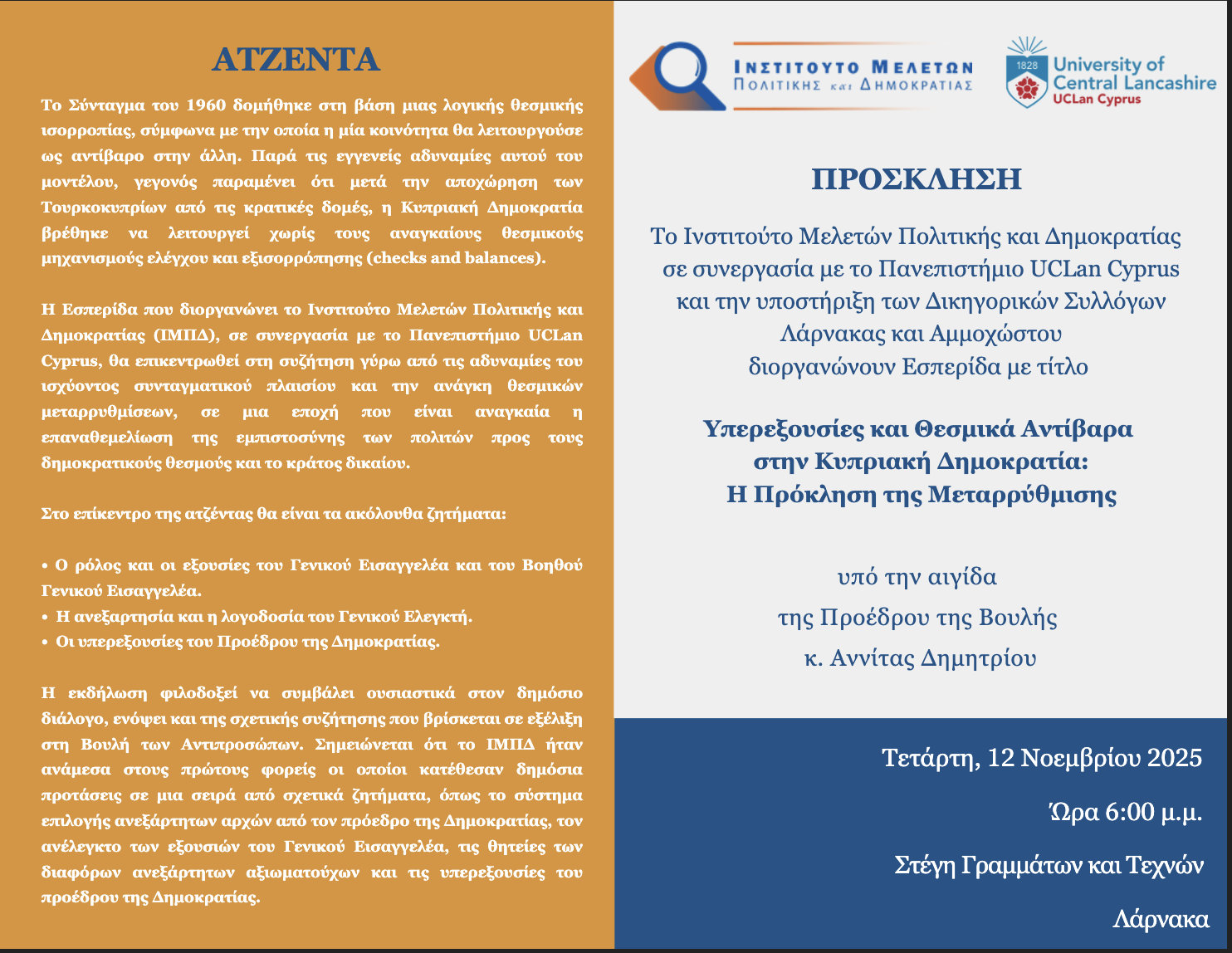 Η Λάρνακα υποδέχεται μια ιδιαίτερα σημαντική εκδήλωση δημόσιου διαλόγου για τη λειτουργία της Δημοκρατίας και την ανάγκη θεσμικών μεταρρυθμίσεων. Το Ινστιτούτο Μελετών Πολιτικής και Δημοκρατίας (ΙΜΠΔ), σε συνεργασία με το Πανεπιστήμιο UCLan Cyprus και με την υποστήριξη των Δικηγορικών Συλλόγων Λάρνακας και Αμμοχώστου, διοργανώνει Εσπερίδα με τίτλο «Υπερεξουσίες και Θεσμικά Αντίβαρα στην Κυπριακή Δημοκρατία: Η Πρόκληση της Μεταρρύθμισης».