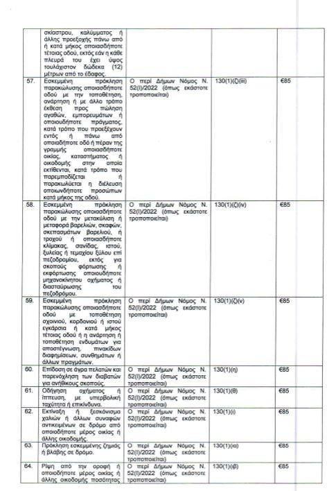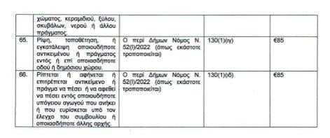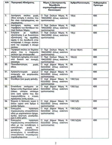 Σύμφωνα με το νομοσχέδιο, το εξώδικο των 85 ευρώ θα επιβάλλεται για 22 διαφορετικά αδικήματα, όπως το τίναγμα χαλιών στο δρόμο, η έκχυση νερού ή άλλων υγρών από δρόμο ή αυλάκι, η πρόκληση θορύβου από συνεχή γαύγισμα σκύλων, αλλά και η παρακώλυση οδού από αυτοκίνητο, φορτηγό, άμαξα ή ακόμα και άλογο.
