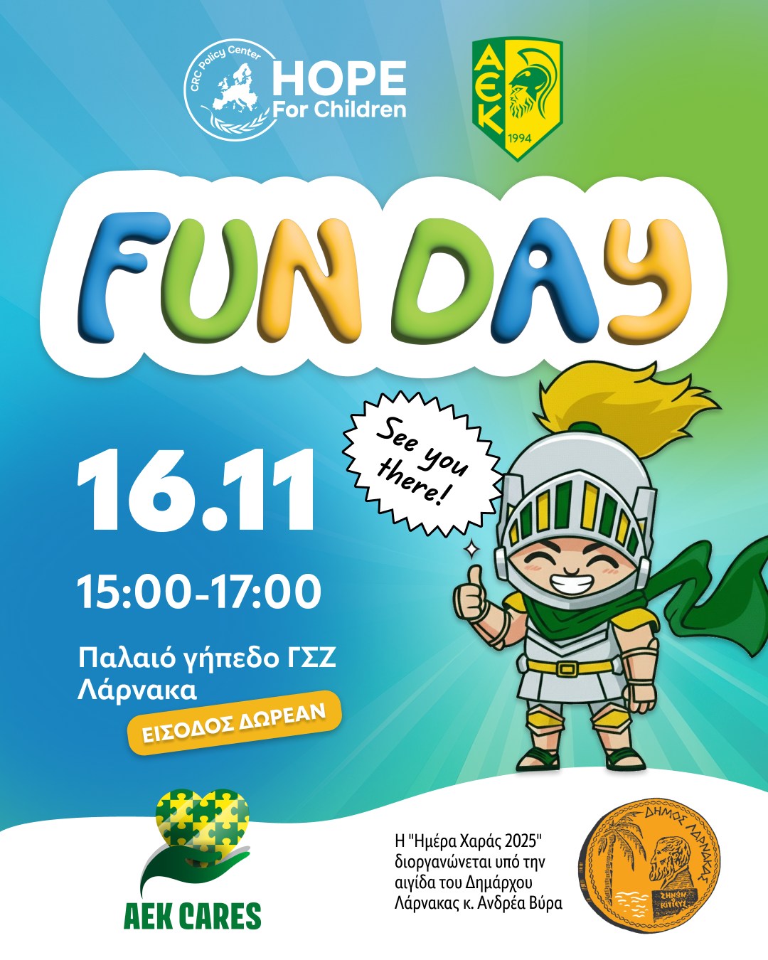 Με αφορμή την Παγκόσμια Ημέρα του Παιδιού, ο οργανισμός “Hope For Children” CRC Policy Center, σε συνεργασία με την ΑΕΚ Λάρνακας και υπό την αιγίδα του Δημάρχου Λάρνακας, κ. Ανδρέα Βύρα, διοργανώνουν μια υπέροχη εκδήλωση αφιερωμένη στα παιδιά – το Fun Day!